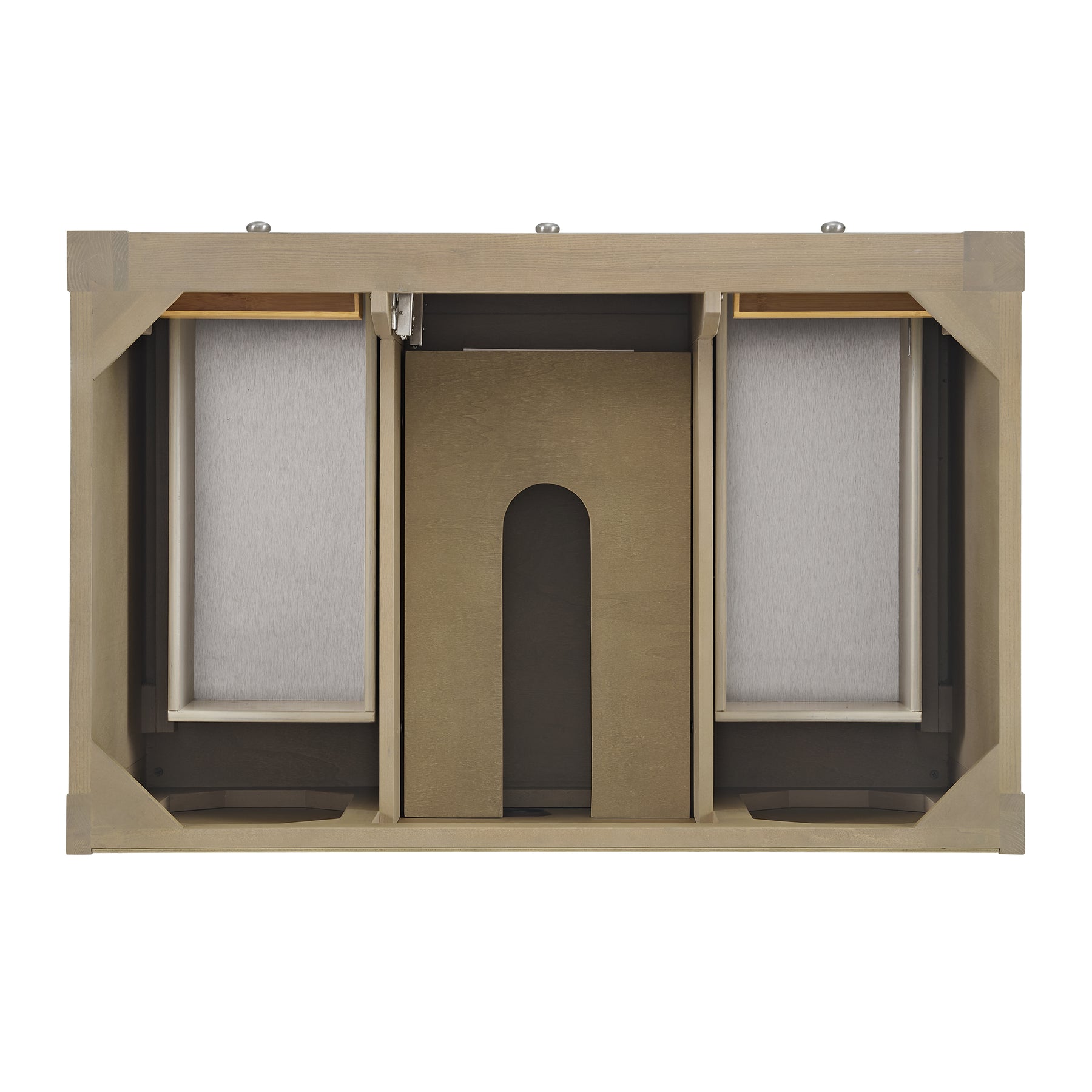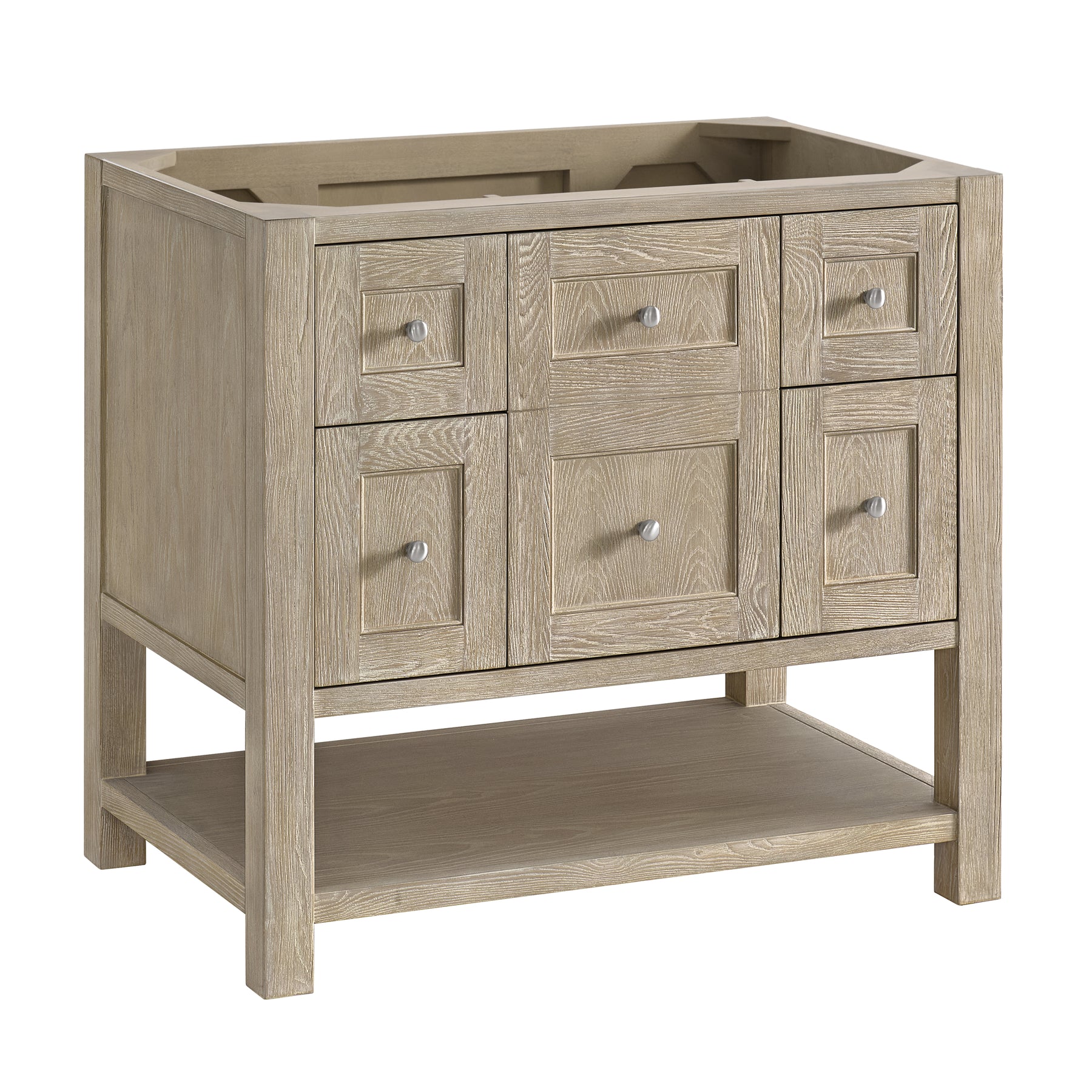 The Breckenridge 36" Single Vanity is a fresh take on traditional Mission furniture that easily transitions to Modern Farmhouse style with an air of understated sophistication. Satin Nickel knobs complement the Whitewashed Oak finish, while the neatly inset door and drawer fronts lend a fresh appeal to this clean-lined classic. A single-door cabinet opens to reveal an interior shelf equipped with convenient built-in USB/120V power outlet. This console-style vanity also features two top-row tip-out drawers, two standard full-extension drawers, and an open lower shelf for additional storage. A warm Eternal Marfil Silestone top with undermount sink completes the look.