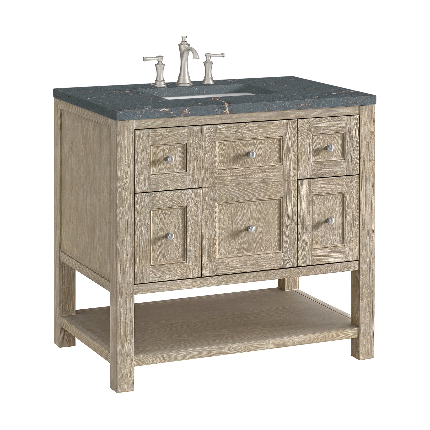 The Breckenridge 36" Single Vanity is a fresh take on traditional Mission furniture that easily transitions to Modern Farmhouse style with an air of understated sophistication. Satin Nickel knobs complement the Whitewashed Oak finish, while the neatly inset door and drawer fronts lend a fresh appeal to this clean-lined classic. A single-door cabinet opens to reveal an interior shelf equipped with convenient built-in USB/120V power outlet. This console-style vanity also features two top-row tip-out drawers, two standard full-extension drawers, and an open lower shelf for additional storage. A gorgeous Parisien Bleu Silestone top with undermount sink completes the look.