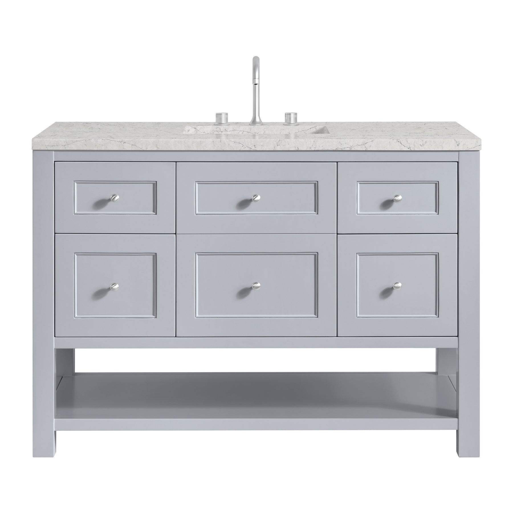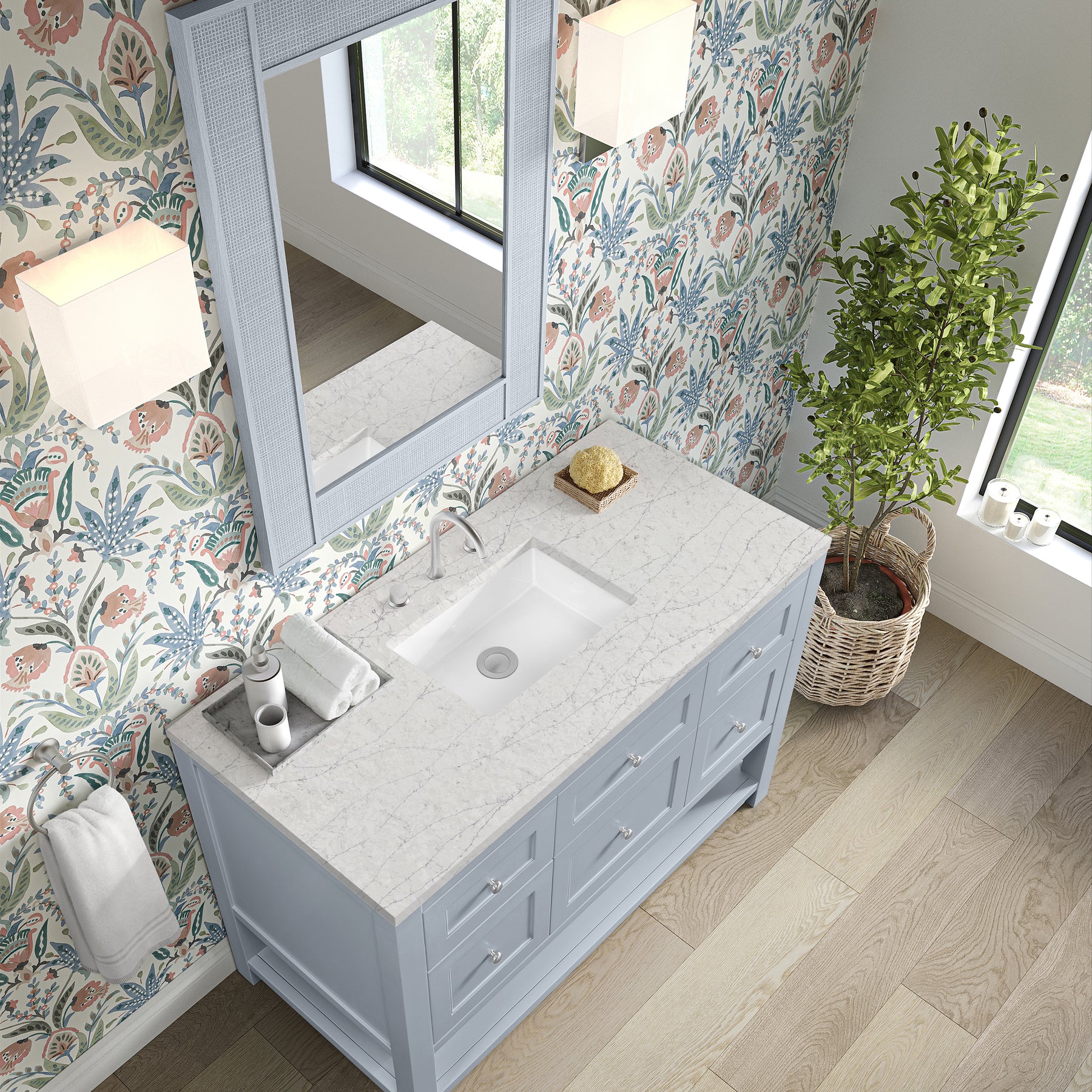 The Breckenridge 48" Single Vanity is a fresh take on traditional Mission furniture that easily transitions to Modern Farmhouse style with an air of understated sophistication. Satin Nickel knobs complement the Serenity Blue finish, while the neatly inset door and drawer fronts lend a fresh appeal to this clean-lined classic. A single-door cabinet opens to reveal an interior shelf equipped with convenient built-in USB/120V power outlet. This console-style vanity also features four full-extension drawers and an open lower shelf for additional storage. A beautiful Eternal Jasmine Pearl Silestone top with undermount sink completes the look.
