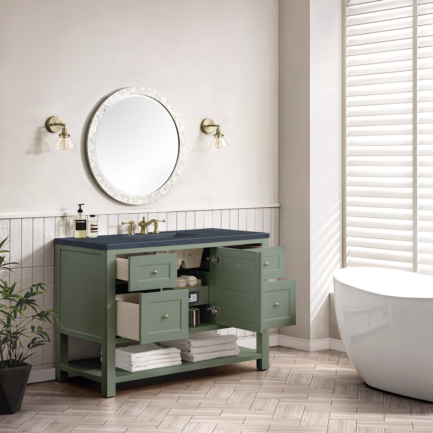 The Breckenridge 48" Single Vanity is a fresh take on traditional Mission furniture that easily transitions to Modern Farmhouse style with an air of understated sophistication. Champagne Brass knobs complement the Smokey Celadon finish, while the neatly inset door and drawer fronts lend a fresh appeal to this clean-lined classic. A single-door cabinet opens to reveal an interior shelf equipped with convenient built-in USB/120V power outlet. This console-style vanity also features four full-extension drawers and an open lower shelf for additional storage. A suede-finished Charcoal Soapstone Silestone top with undermount sink completes the look.