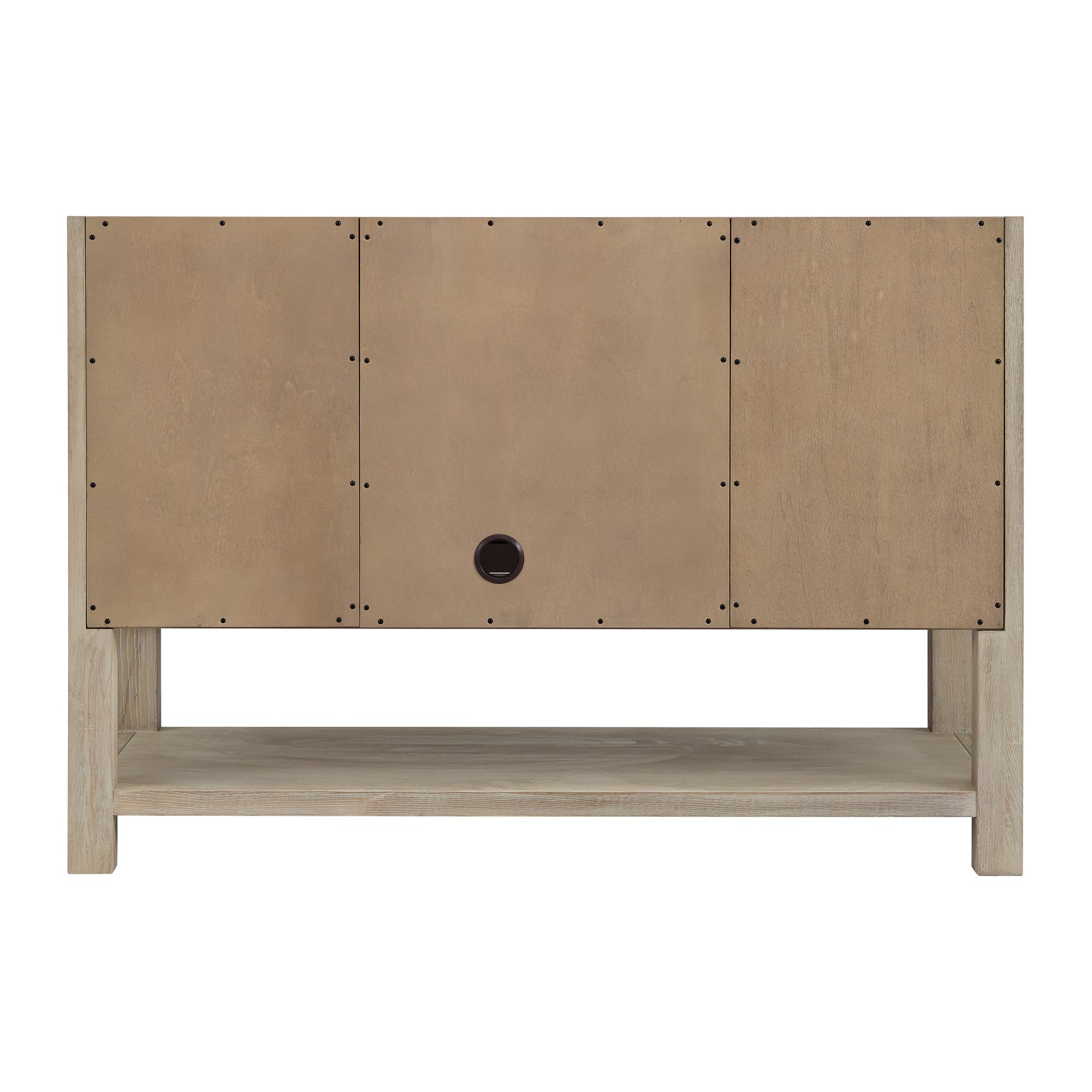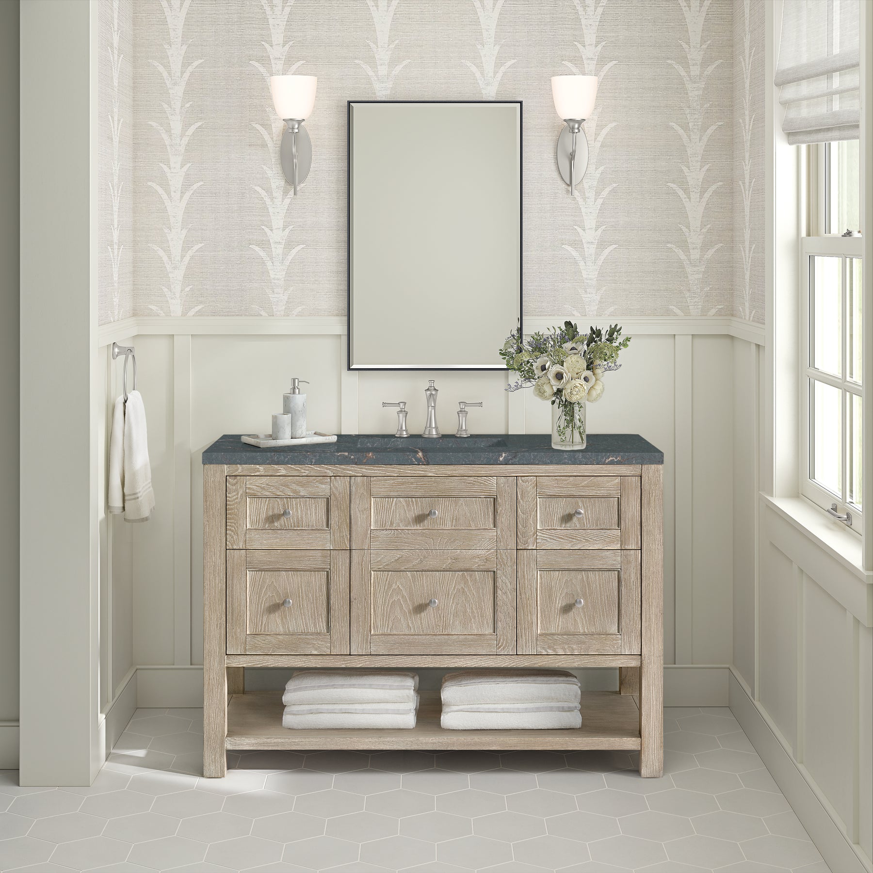 The Breckenridge 48" Single Vanity is a fresh take on traditional Mission furniture that easily transitions to Modern Farmhouse style with an air of understated sophistication. Satin Nickel knobs complement the Whitewashed Oak finish, while the neatly inset door and drawer fronts lend a fresh appeal to this clean-lined classic. A single-door cabinet opens to reveal an interior shelf equipped with convenient built-in USB/120V power outlet. This console-style vanity also features four full-extension drawers and an open lower shelf for additional storage. A gorgeous Parisien Bleu Silestone top with undermount sink completes the look.