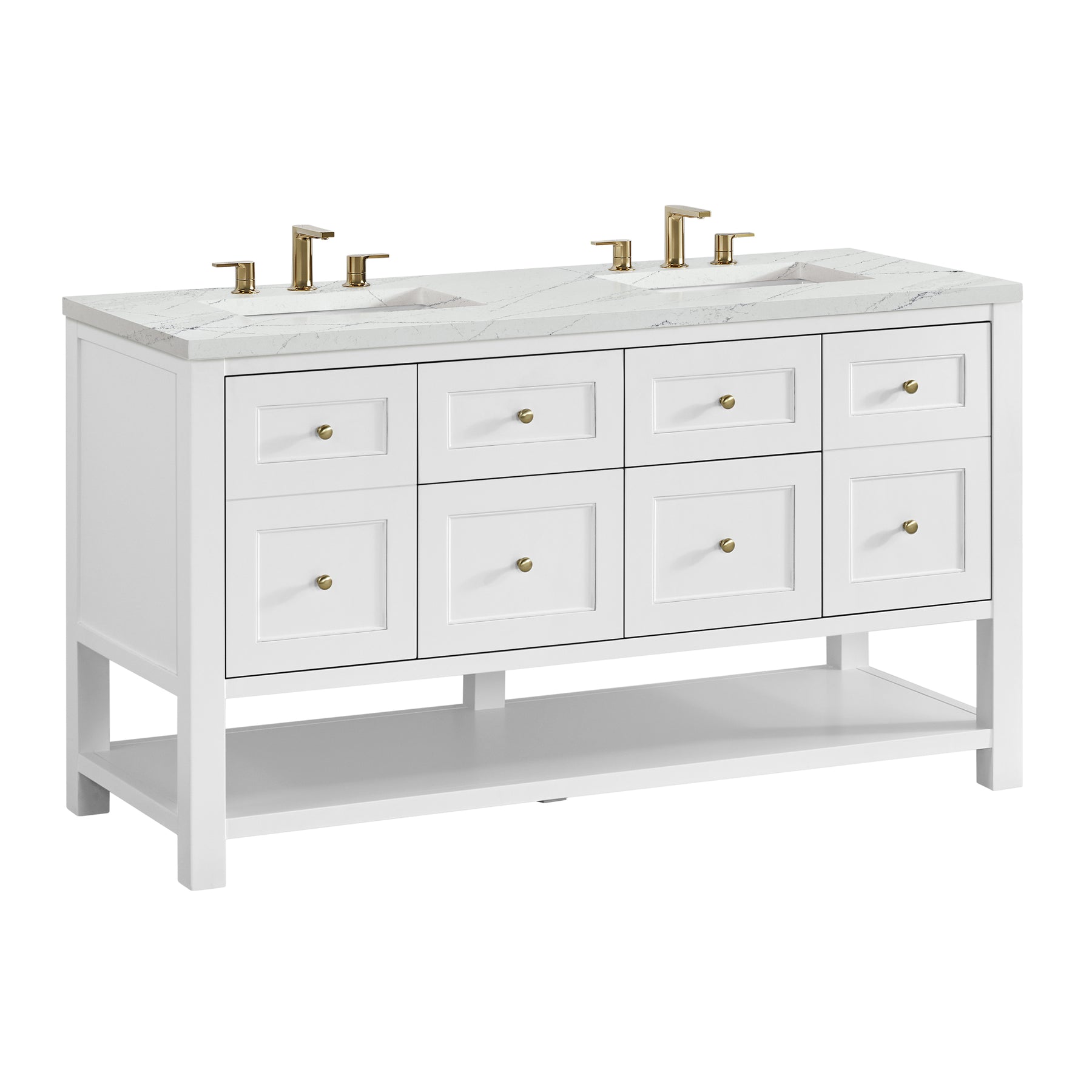 The Breckenridge 60" Double Vanity is a fresh take on traditional Mission furniture that easily transitions to Modern Farmhouse style with an air of understated sophistication. Champagne Brass knobs complement the Bright White finish, while the neatly inset door and drawer fronts lend a fresh appeal to this clean-lined classic. Two single-door cabinets open to reveal interior shelves equipped with a convenient built-in USB/120V power outlet. This console-style vanity also features two top-row tip-out drawers, two standard full-extension drawers, and an open lower shelf for additional storage. A stunning Ethereal Noctis Silestone top with undermount sink completes the look.