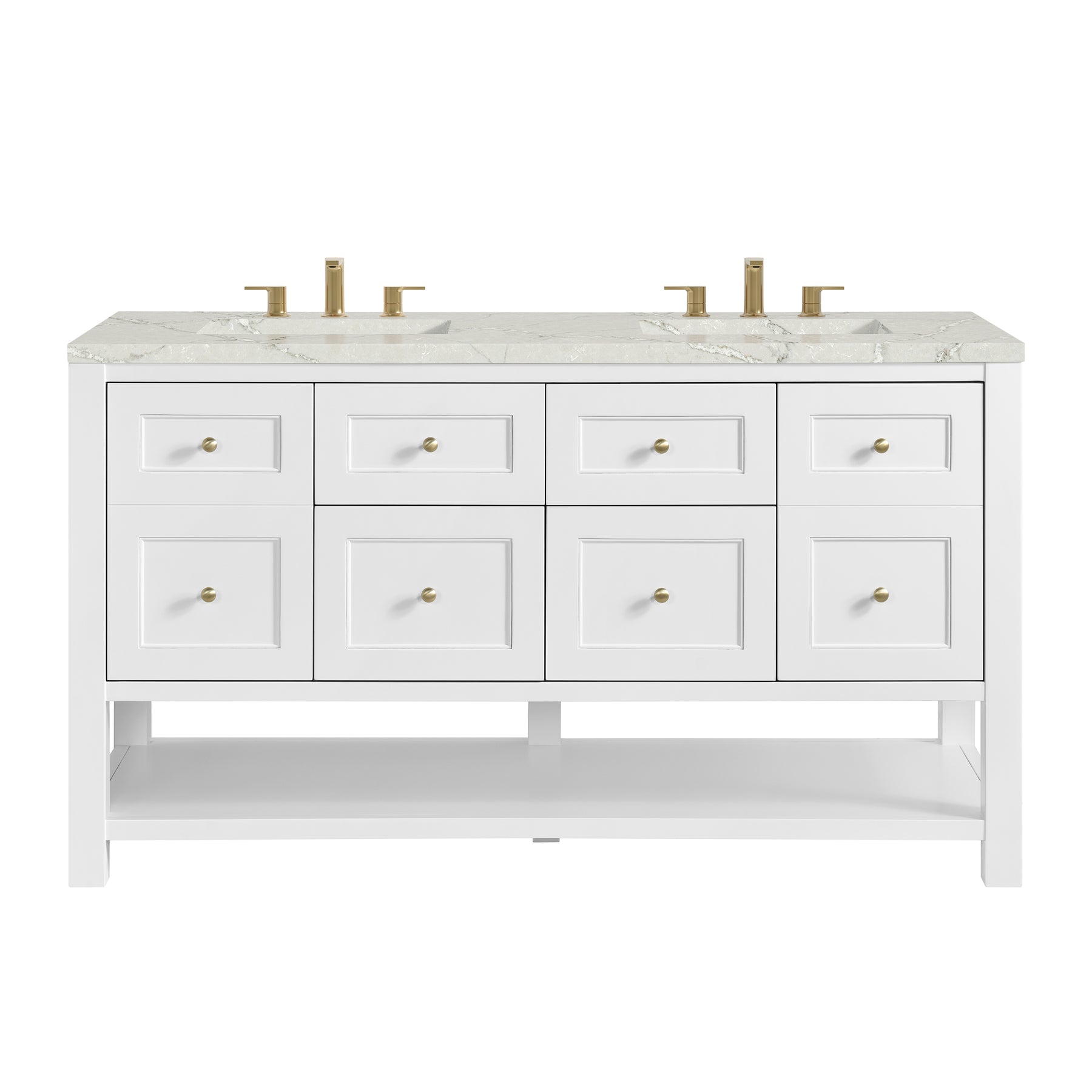The Breckenridge 60" Double Vanity by James Martin Vanities is a fresh take on traditional Mission furniture that easily transitions to Modern Farmhouse style with an air of understated sophistication. Champagne Brass knobs complement the Bright White finish, while the neatly inset door and drawer fronts lend a fresh appeal to this clean-lined classic. Two single-door cabinets open to reveal interior shelves equipped with a convenient built-in USB/120V power outlet. This console-style vanity also features two top-row tip-out drawers, two standard full-extension drawers, and an open lower shelf for additional storage. A beautiful Victorian Silver Silestone® top with undermount sinks completes the look.