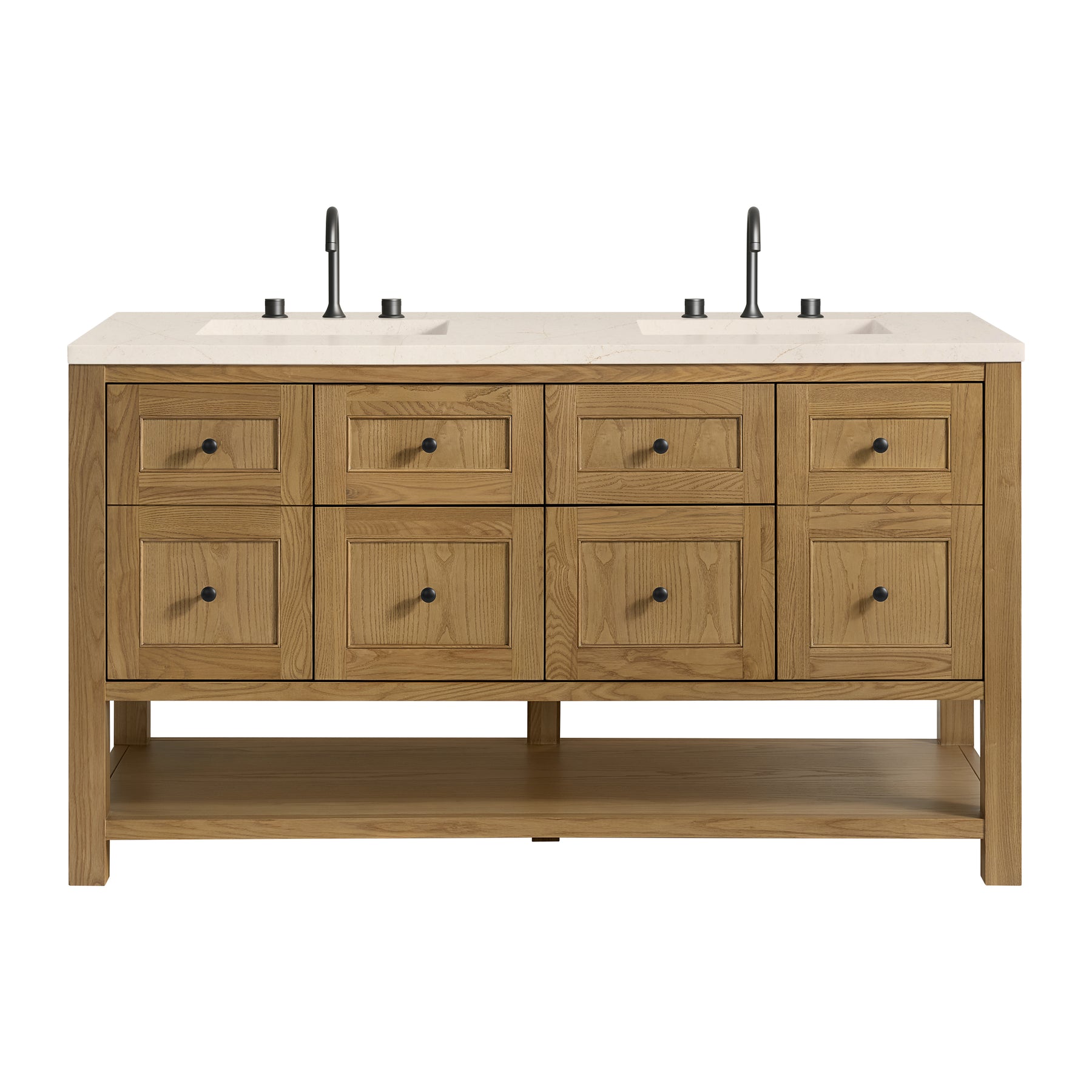The Breckenridge 60" Double Vanity is a fresh take on traditional Mission furniture that easily transitions to Modern Farmhouse style with an air of understated sophistication. Matte Black knobs complement the Light Natural Oak finish, while the neatly inset door and drawer fronts lend a fresh appeal to this clean-lined classic. Two single-door cabinets open to reveal interior shelves equipped with a convenient built-in USB/120V power outlet. This console-style vanity also features two top-row tip-out drawers, two standard full-extension drawers, and an open lower shelf for additional storage. A beautiful Eternal Marfil Silestone top with undermount sinks completes the look.