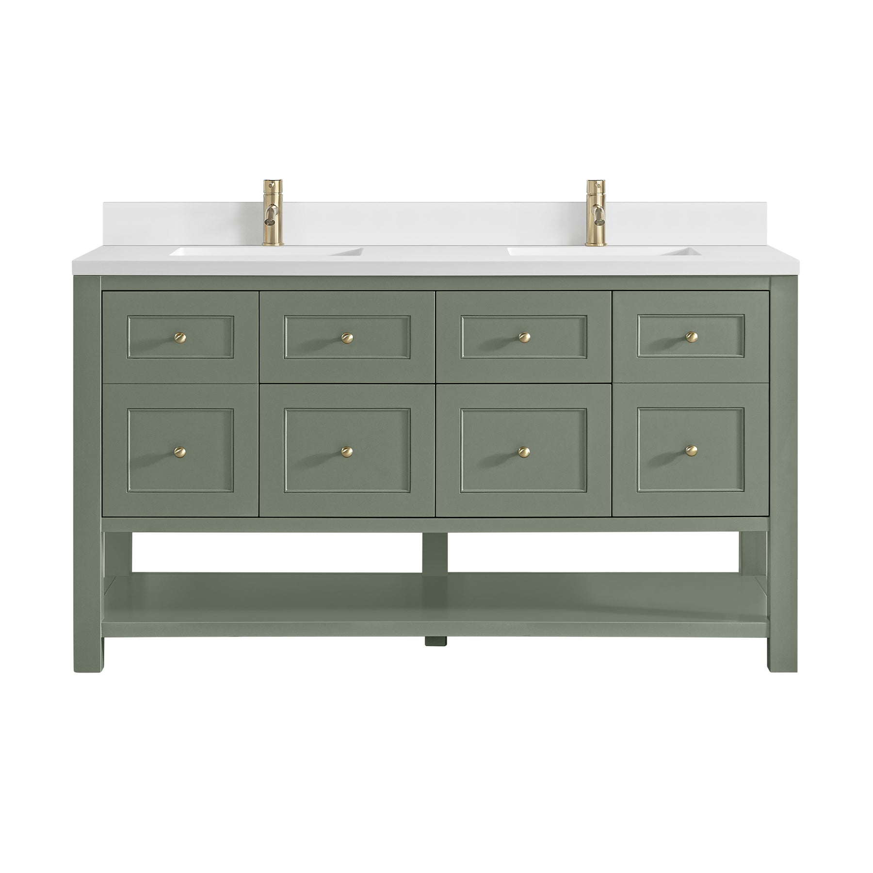 The Breckenridge 60" Double Vanity is a fresh take on traditional Mission furniture that easily transitions to Modern Farmhouse style with an air of understated sophistication. Champagne Brass knobs complement the Smokey Celadon finish, while the neatly inset door and drawer fronts lend a fresh appeal to this clean-lined classic. Two single-door cabinets open to reveal interior shelves equipped with a convenient built-in USB/120V power outlet. This console-style vanity also features two top-row tip-out drawers, two standard full-extension drawers, and an open lower shelf for additional storage. A classic White Zeus Silestone top configured for single-hole faucets with undermount sinks and backsplash complete the look with a contemporary touch.