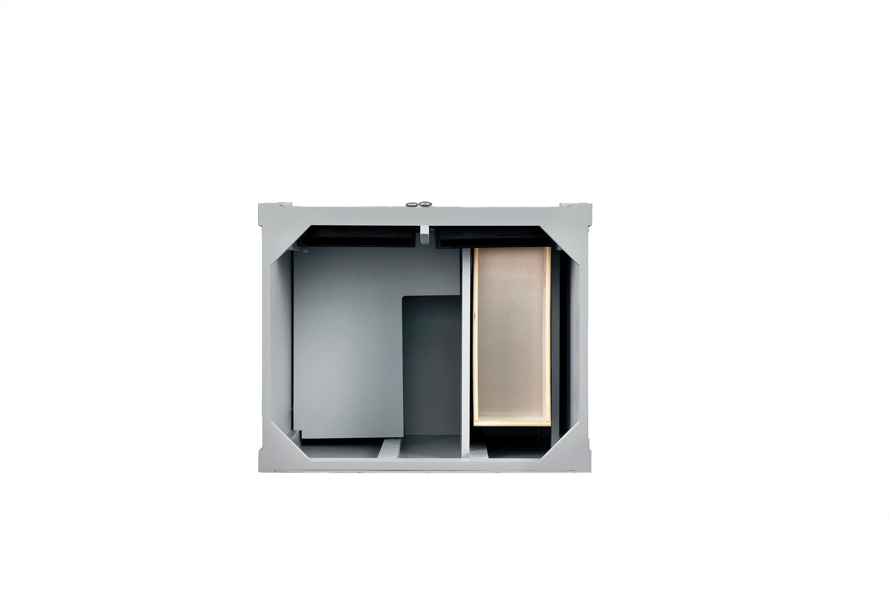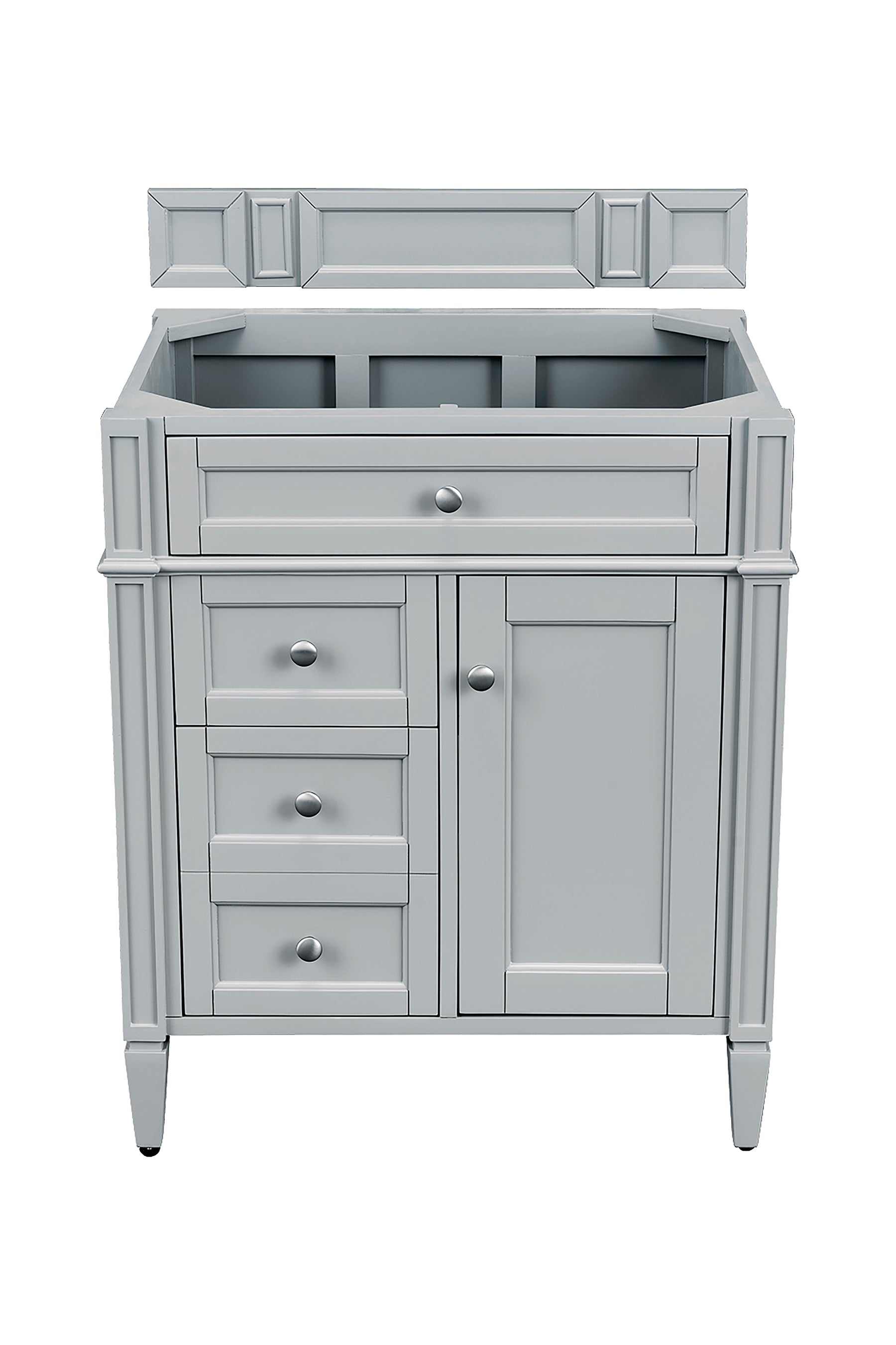 The Brittany 30" Urban Gray Single Vanity by James Martin Vanities features classic details that bridge both traditional and transitional styles. This beautiful piece of furniture includes one hide-away tip-out, top row drawer plus two full-depth side drawers, one of which is double-height for storage of taller items. This cabinet also has one door, which conceals an interior shelf, for ample storage, and a bamboo drawer organizer. Handcrafted in yellow poplar solids and veneers with satin nickel hardware. Matching wood backsplash is included.