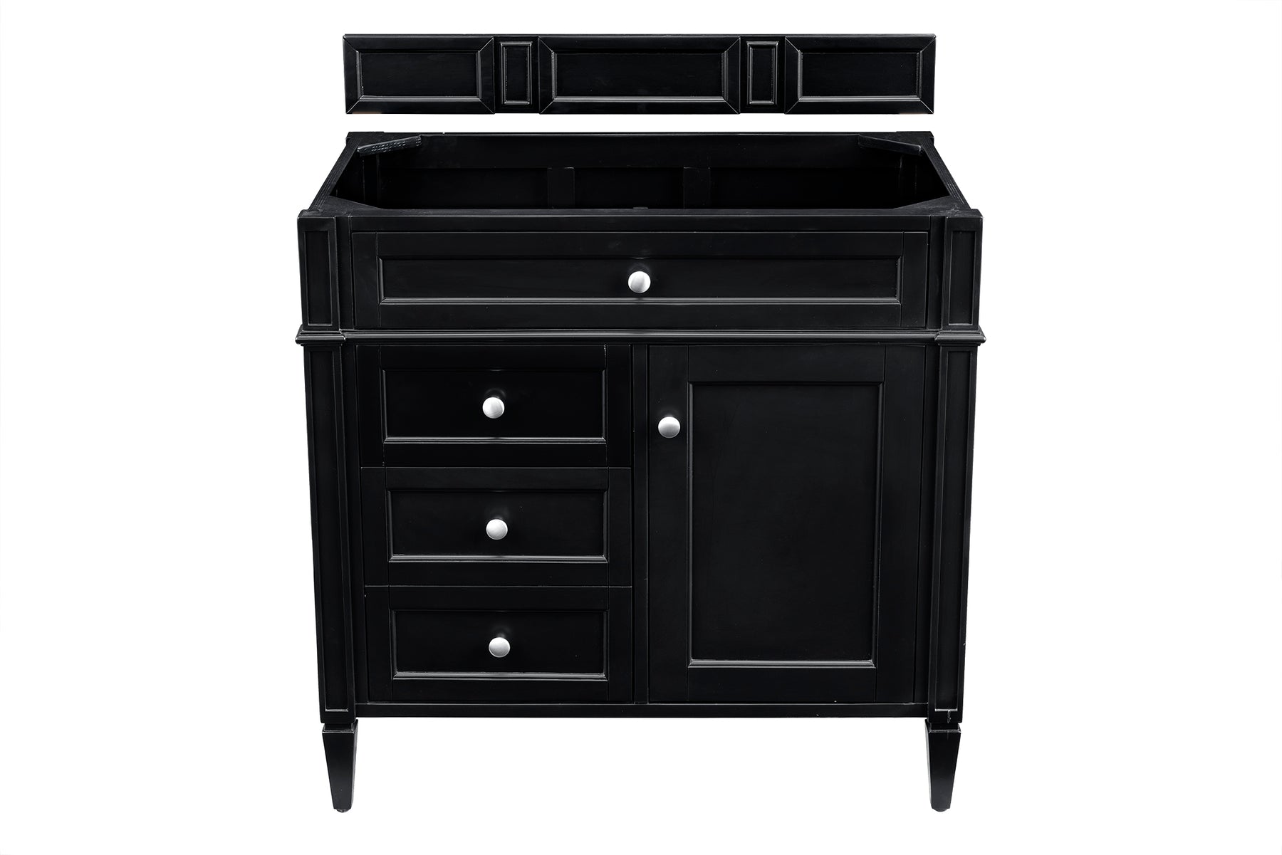 The Brittany 36" Black Onyx Single Vanity by James Martin Vanities features classic details that bridge both traditional and transitional styles. This beautiful piece of furniture includes one hide-away tip-out, top row drawer plus two full-depth side drawers, one of which is double-height for storage of taller items. This cabinet also has one door, which conceals an interior shelf, for ample storage. Handcrafted in yellow poplar solids and veneers with satin nickel hardware. Matching wood backsplash is included.