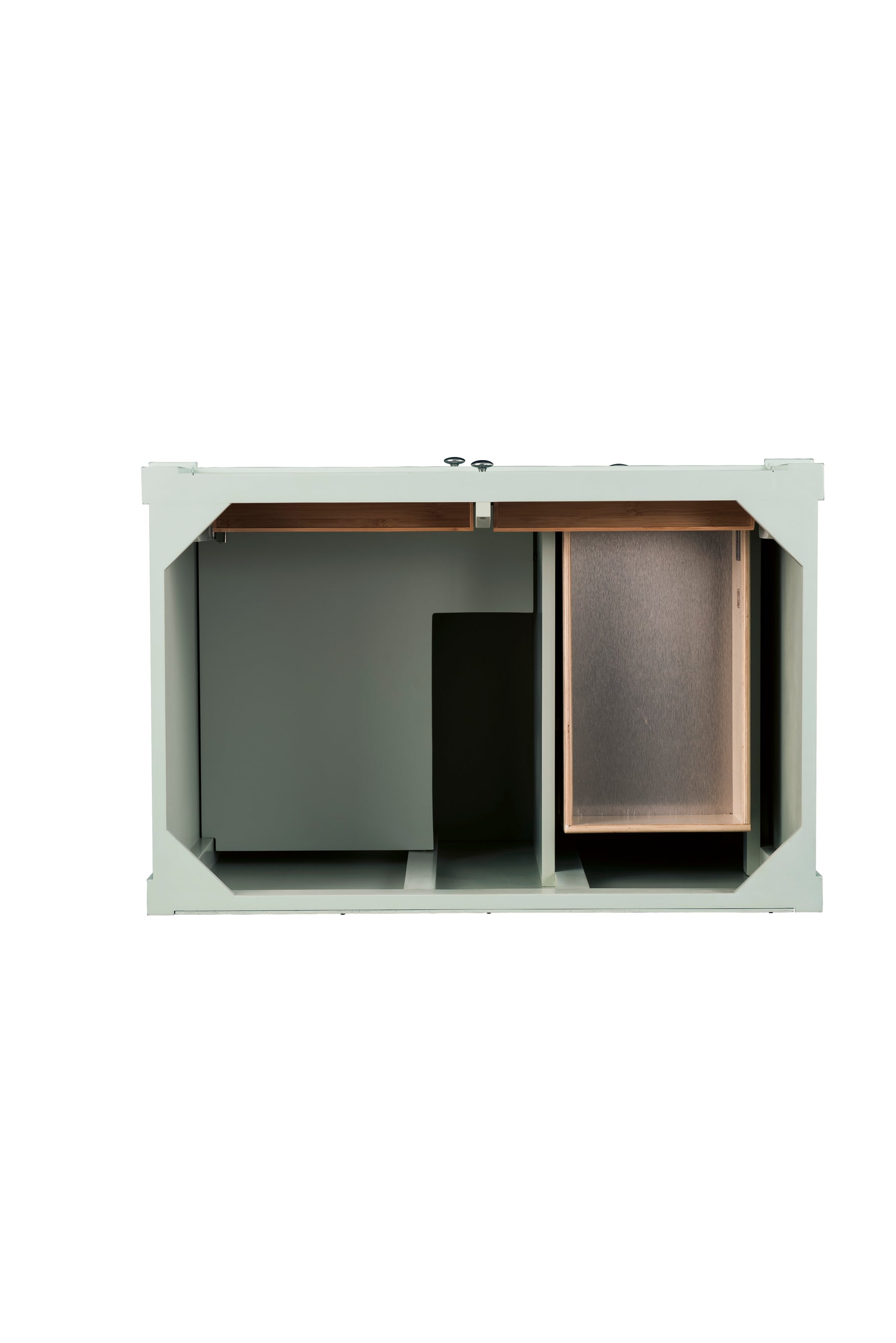 The Brittany 36" Sage Green Single Vanity by James Martin Vanities features classic details that bridge both traditional and transitional styles. This beautiful piece of furniture includes one hide-away tip-out, top row drawer plus two full-depth side drawers, one of which is double-height for storage of taller items. This cabinet also has one door, which conceals an interior shelf, for ample storage. Handcrafted in yellow poplar solids and veneers with satin nickel hardware. Matching wood backsplash is included.