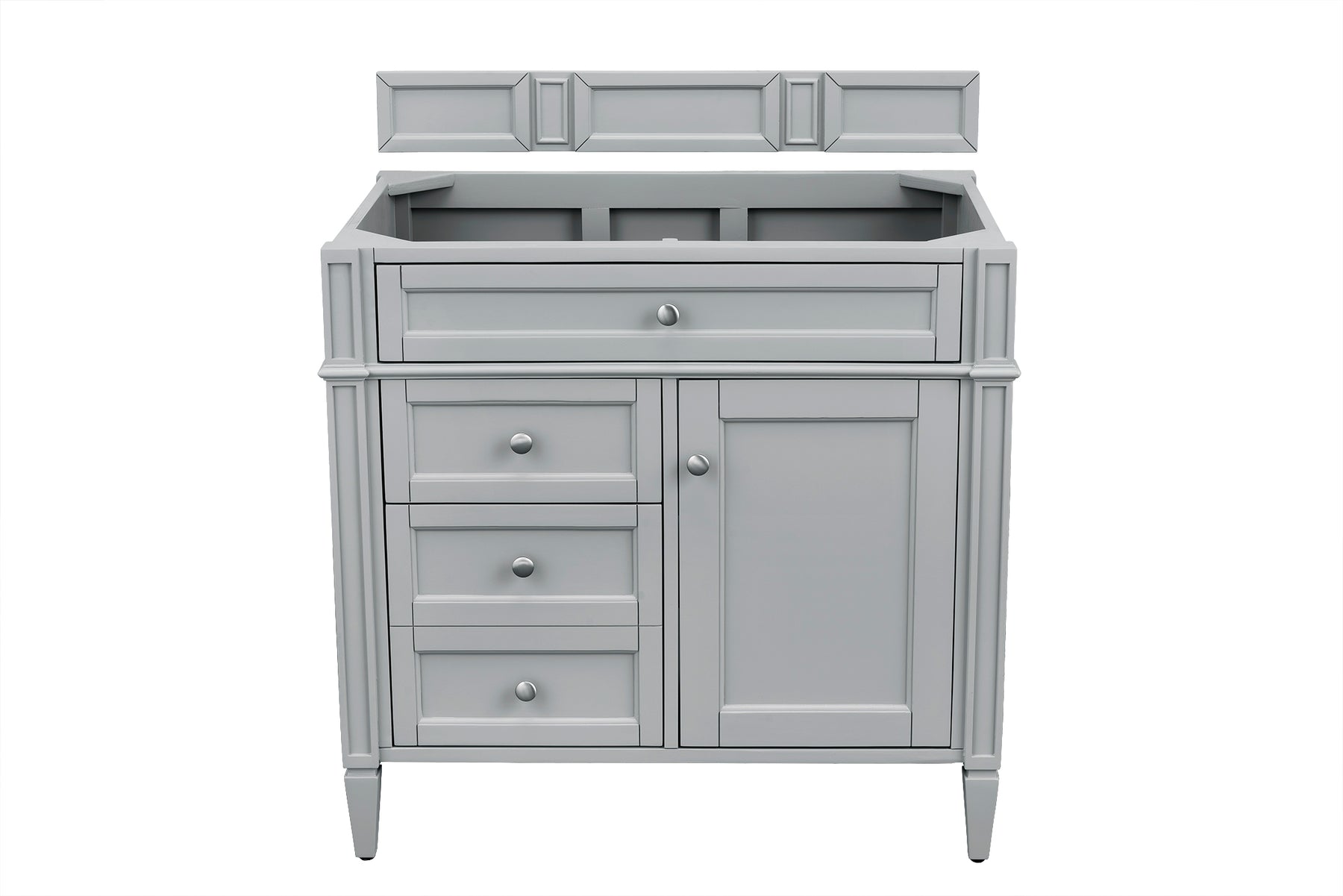The Brittany 36" Urban Gray Single Vanity by James Martin Vanities features classic details that bridge both traditional and transitional styles. This beautiful piece of furniture includes one hide-away tip-out, top row drawer plus two full-depth side drawers, one of which is double-height for storage of taller items. This cabinet also has one door, which conceals an interior shelf, for ample storage. Handcrafted in yellow poplar solids and veneers with satin nickel hardware. Matching wood backsplash is included.