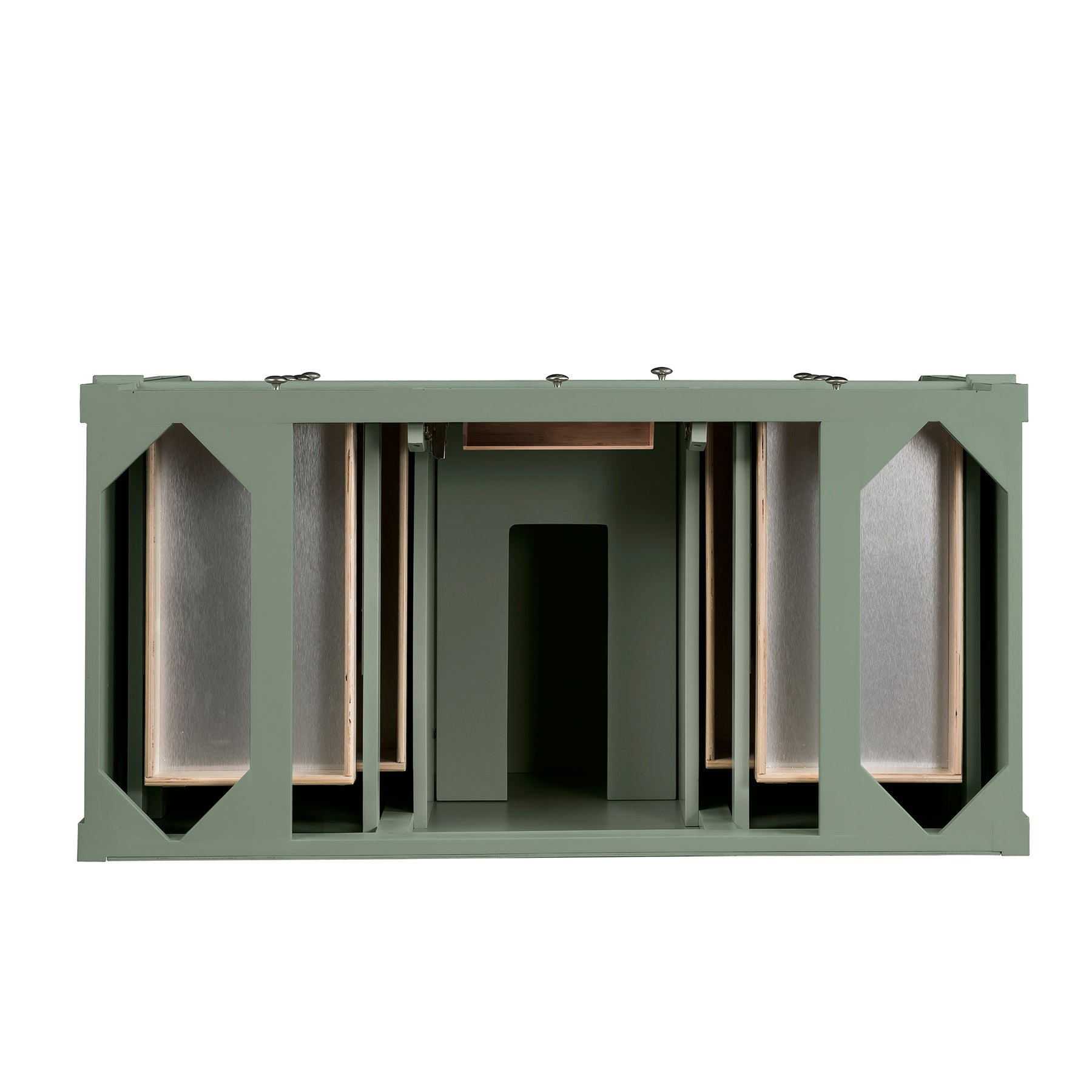 The Smokey Celadon finish on the 48" Brittany Vanity adds a refreshing, natural element to any bathroom space. This moody, yet muted green, with subtle blue and grey undertones, brings the rich, timeless details of the Brittany collection to life. The 48" cabinet, with decorative wood backsplash, features optimal organization with one hide-away tip-out drawer plus six side drawers, two of which are double height for storing taller items. This cabinet also has one door, which conceals an interior shelf. All drawers are lined with an aluminum laminate surface for easy cleaning and are equipped with undermount soft-close slides.