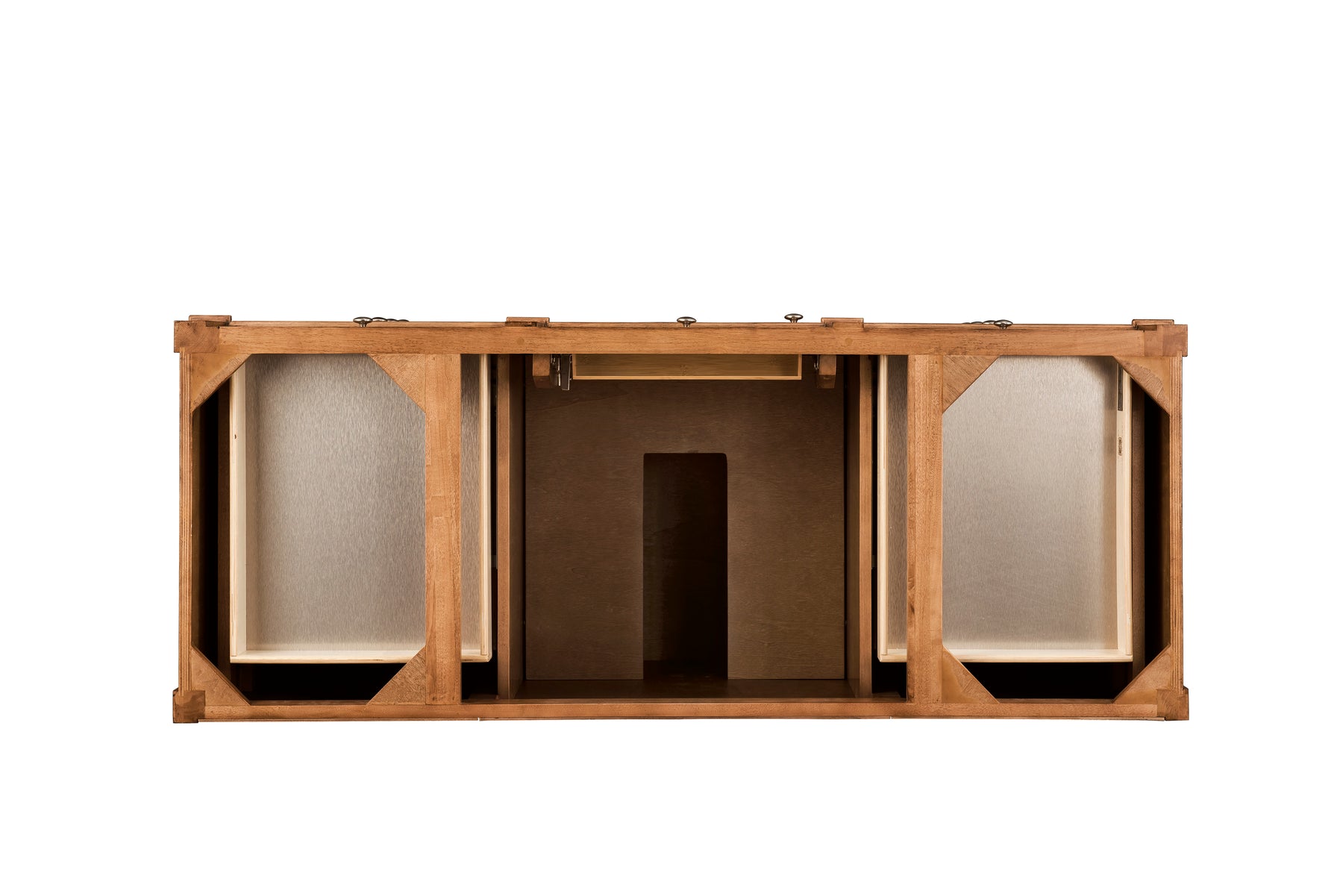 The Brittany 60" Saddle Brown Single Vanity by James Martin Vanities features classic details that bridge both traditional and transitional styles. This beautiful piece of furniture includes one hide-away top row tip-out drawer, plus six full-depth drawers, two of which are double-height for storage of taller items. This cabinet also has one door, which conceals an interior shelf, for ample storage. Handcrafted in yellow poplar solids and veneers with satin nickel hardware. Matching wood backsplash is included.