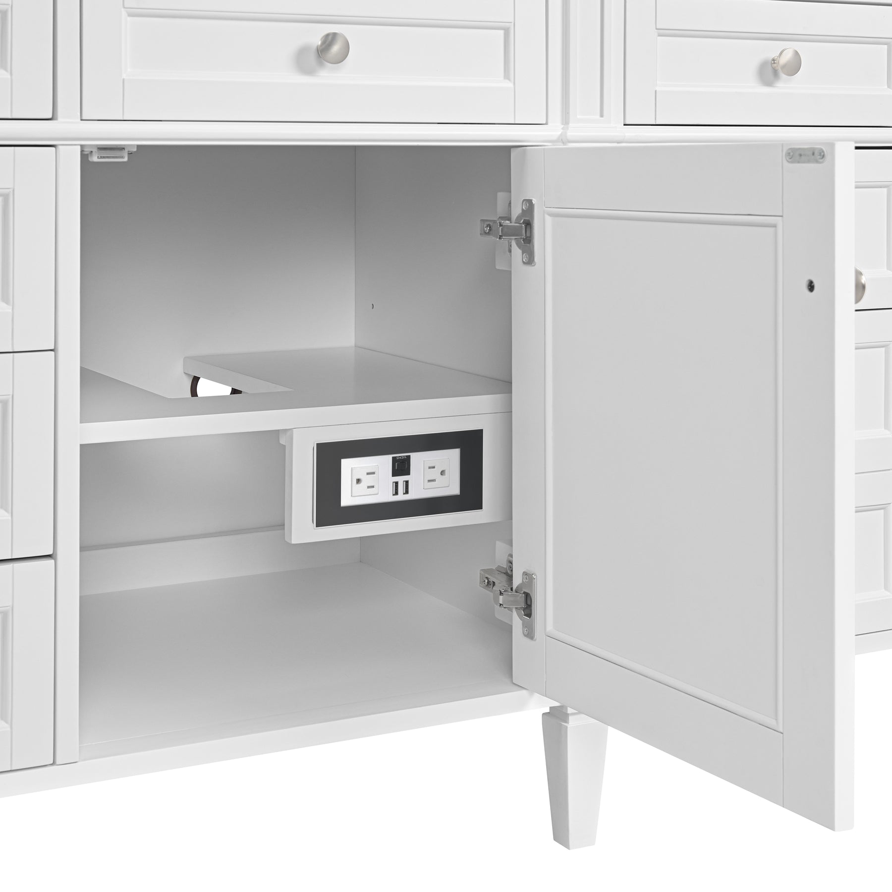 The 84" Brittany Double Vanity in Bright White by James Martin Vanities features optimal organization with two soft-close tip-out drawers with removable bamboo inserts and 11 full-extension drawers, all of which are lined with an aluminum laminate surface for easy cleaning and feature soft-close undermount glides. This cabinet has two doors, each concealing an interior shelf with integrated electric/USB ports. Complete the look by adding one a coordinating 3cm top to create the perfect centerpiece for your bathroom!