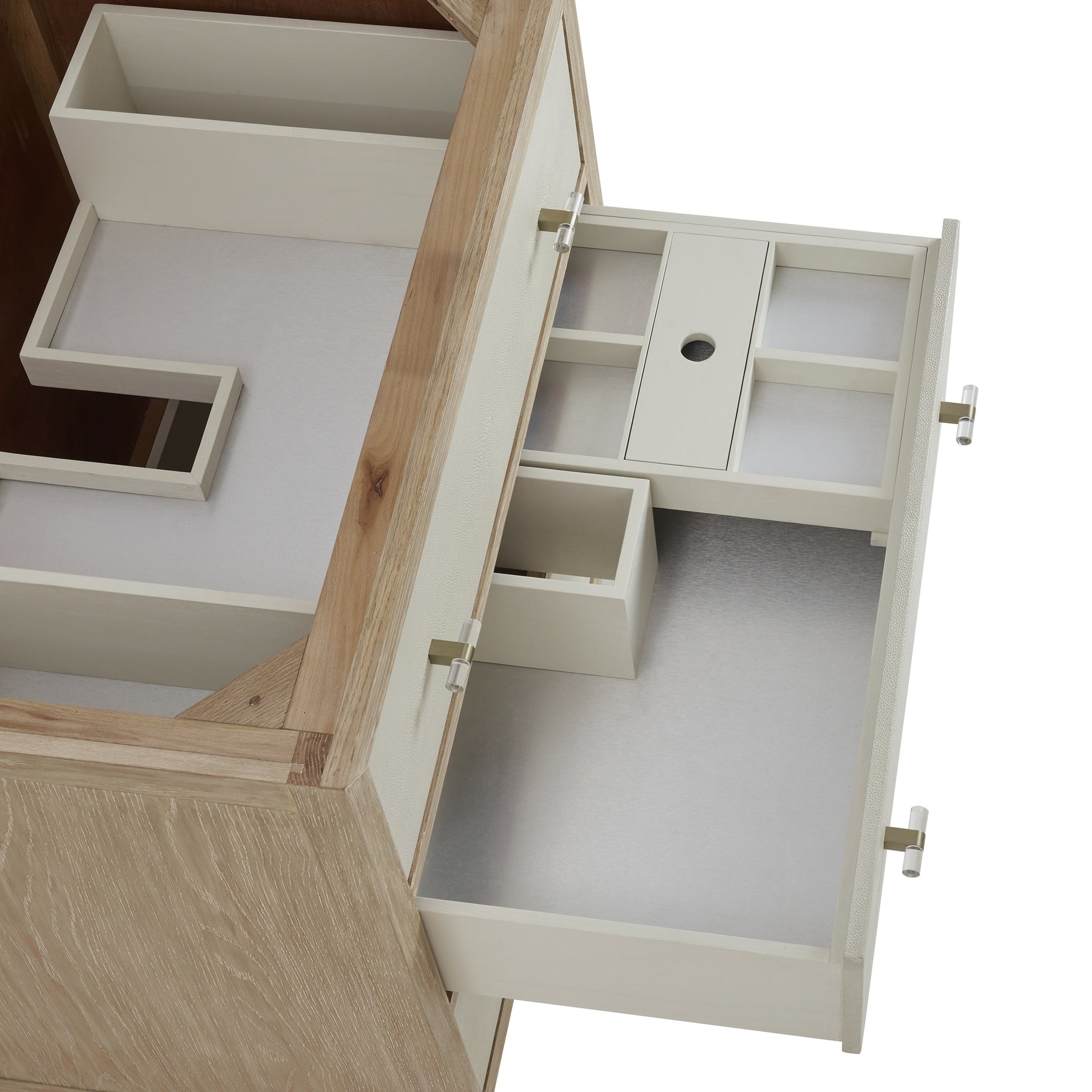 The luxurious Celeste 36" single vanity is a sophisticated statement in style. Featuring embossed shagreen drawer facings complemented by acrylic and brass toggle-style knobs, the vanity boasts a sleek silhouette in a Sunwashed Oak finish. Celeste features three expansive full-extension soft-close drawers to make this vanity as functional as it is beautiful. Complete the look by pairing with one of our Silestone tops with an undermount sink.