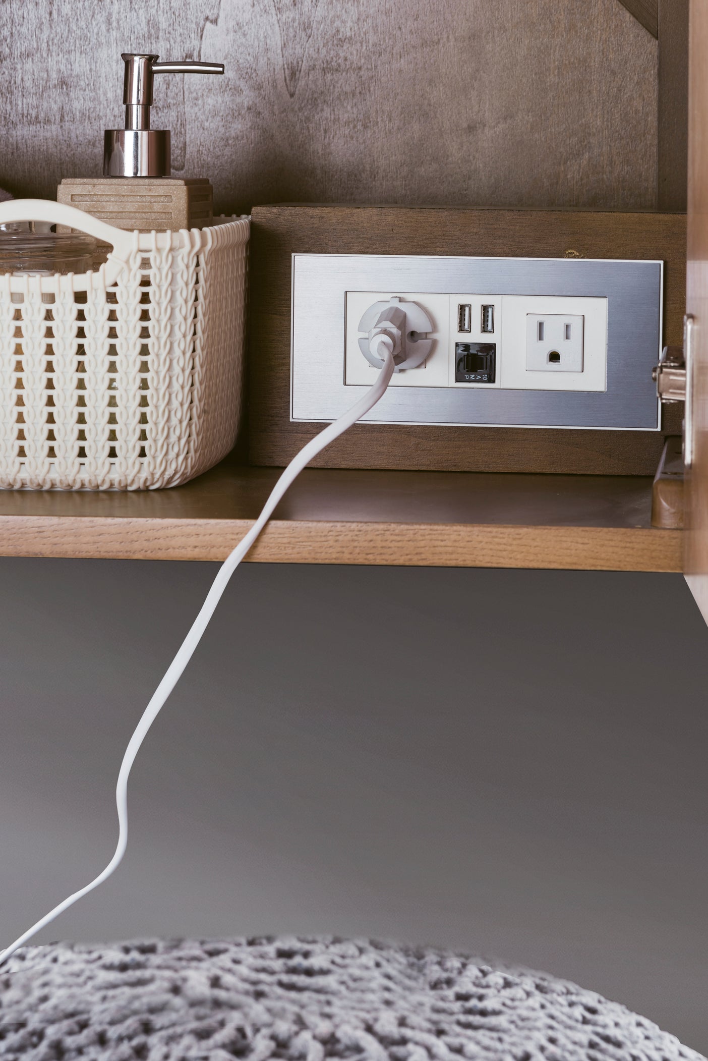The Columbia 72" Latte Oak Double Vanity offers maximum storage with four soft-closing doors and three soft-closing drawers. This cabinet includes premium features such as one solid bamboo drawer organizer and one 120 Volt UL Rated electrical component with two electrical and two USB outlets. Cabinet includes Brushed Nickel door and drawer pulls. Glossy White Composite Stone countertop with integrated wide, angled trough-style sink. This wall-mounted vanity includes heavy duty mounting brackets to create a modern look.