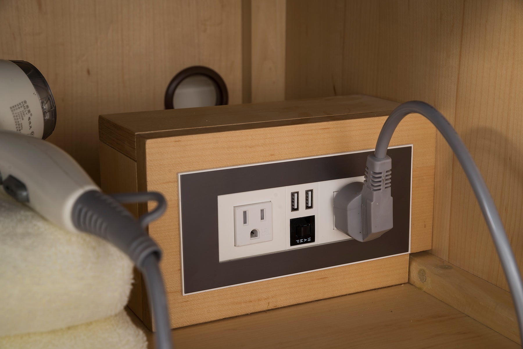 The Columbia 72" Ash Gray Single Vanity offers maximum storage with two soft-closing doors, three soft-closing drawers, and lower shelf space. This cabinet includes premium features such as one solid bamboo drawer organizer and one 120 Volt UL Rated electrical component with two electrical and two USB outlets. The Radiant Gold finished base coordinates with the pulls. Dusk Grey Glossy Composite Stone countertop with integrated wide, angled trough-style sink.