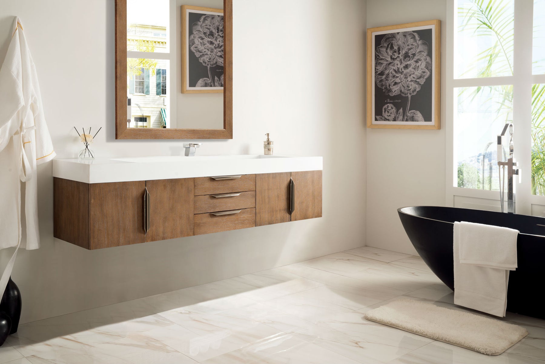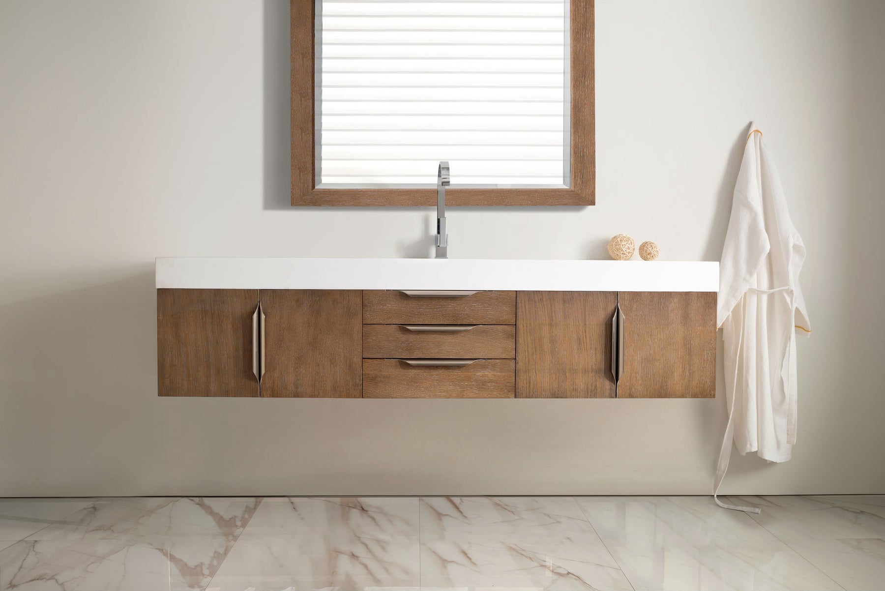 The Columbia 72" Latte Oak Single Vanity offers maximum storage with four soft-closing doors and three soft-closing drawers. This cabinet includes premium features such as one solid bamboo drawer organizer and one 120 Volt UL Rated electrical component with two electrical and two USB outlets. Cabinet includes Brushed Nickel door and drawer pulls. Glossy White Composite Stone countertop with integrated wide, angled trough-style sink. This wall-mounted vanity includes heavy duty mounting brackets to create a modern look.