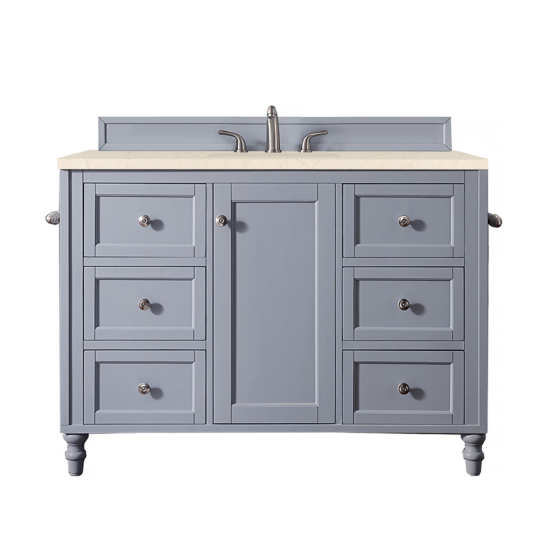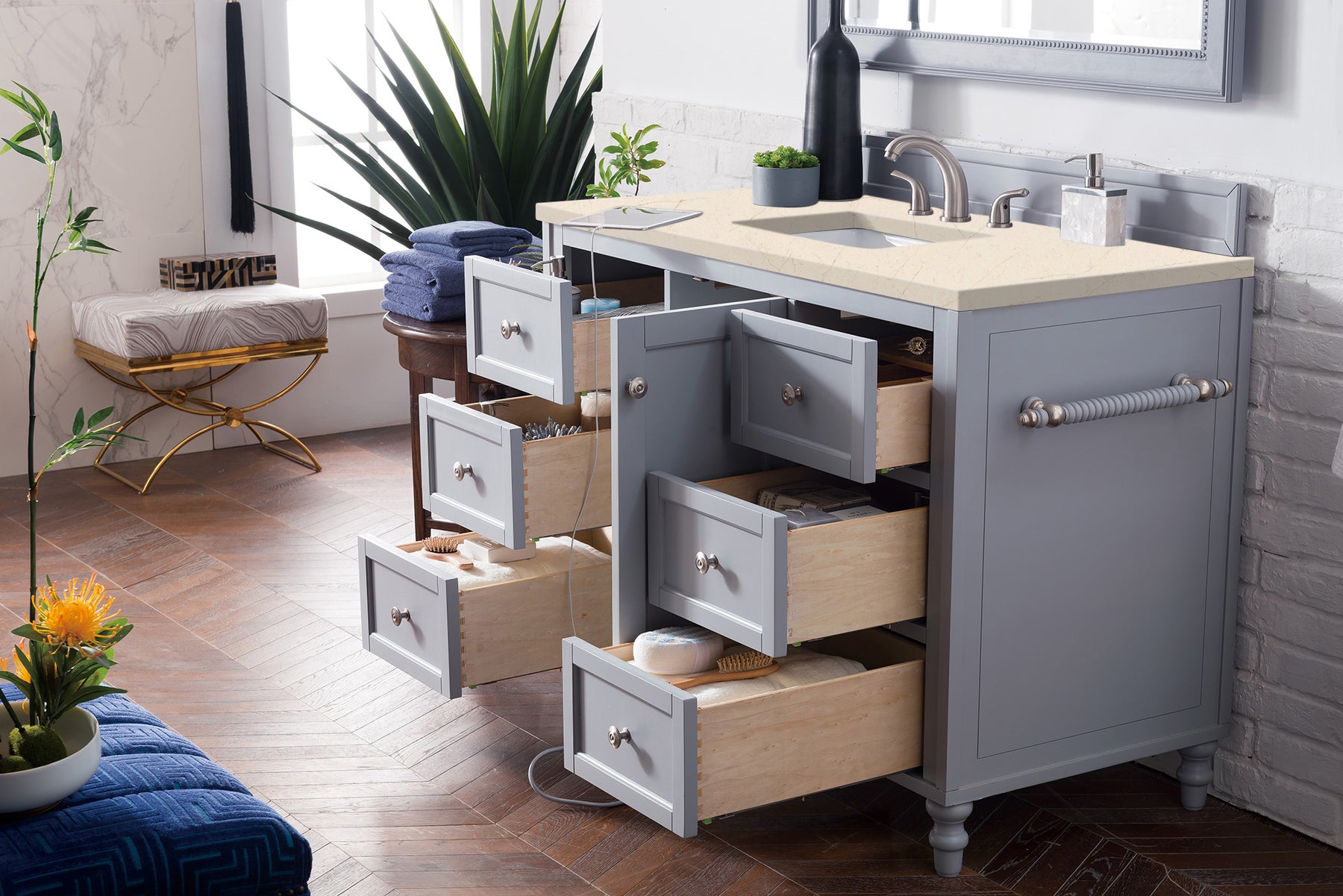 The Copper Cove Encore 48" Silver Gray Single Vanity by James Martin Vanities features optional towel bars, a bamboo drawer organizer, an electrical outlet with two USB ports, and interior shelf space. This cabinet also includes a decorative wood backsplash. The look is completed with a 3 CM eased edge Eternal Marfil Silestone top with one white ceramic rectangular sink.