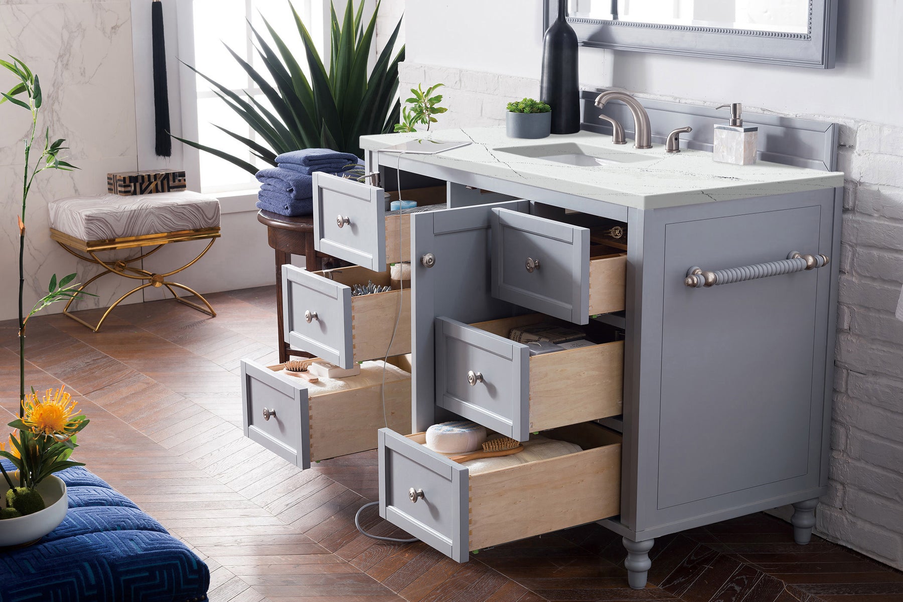 The Copper Cove Encore 48" Silver Gray Single Vanity by James Martin Vanities features optional towel bars, a bamboo drawer organizer, an electrical outlet with two USB ports, and interior shelf space. This cabinet also includes a decorative wood backsplash. The look is completed with a 3 CM eased edge Ethereal Noctis Silestone top with one white ceramic rectangular sink.