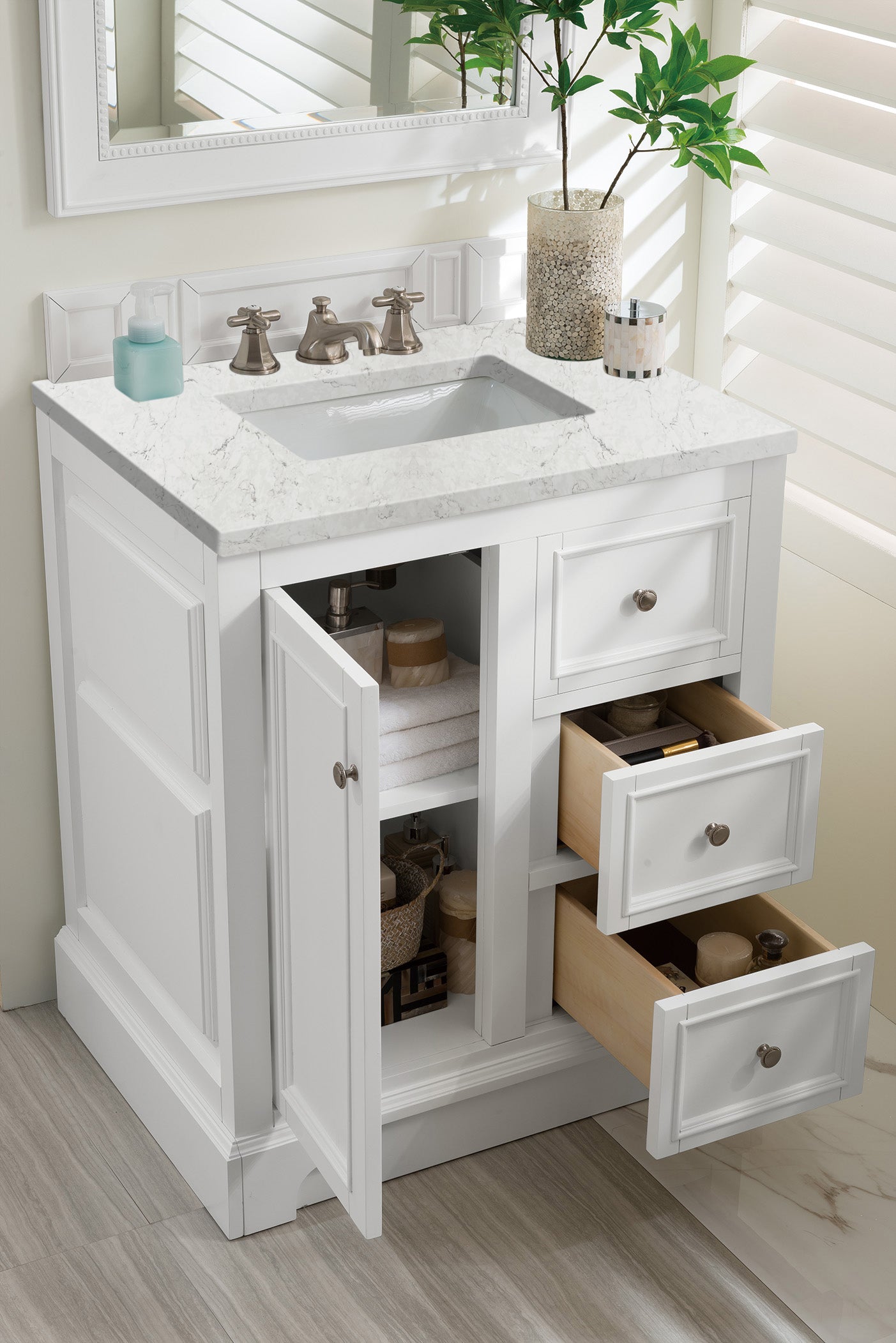 The De Soto 30" Bright White Single Vanity was designed to fulfill a wide range of tasks. Storage and convenience are foremost in this collection. The De Soto series provides ample storage in each of the six available widths and configurations. Cabinets are crafted from North American yellow poplar hardwoods and veneers. Low maintenance is provided with the full plinth base located behind the rounded bracket feet. Premium features in this series include beautiful faux-shagreen drawer organizers. Optional wood backsplash included. The look is completed with a 3 CM eased edge Eternal Pearl Jasmine Silestone top with one white ceramic rectangular sink.