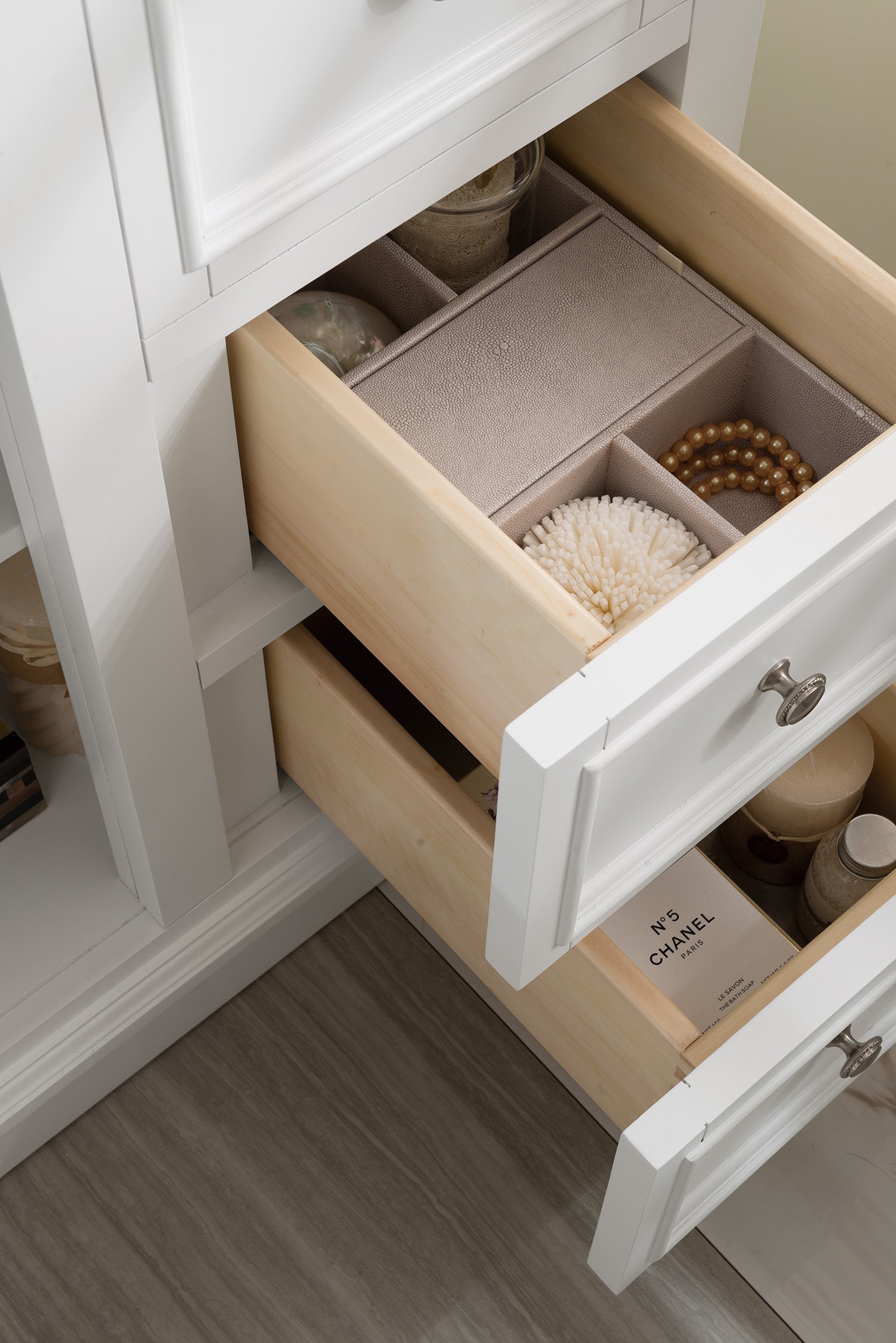 The De Soto 30" Bright White Single Vanity was designed to fulfill a wide range of tasks. Storage and convenience are foremost in this collection. The De Soto series provides ample storage in each of the six available widths and configurations. Cabinets are crafted from North American yellow poplar hardwoods and veneers. Low maintenance is provided with the full plinth base located behind the rounded bracket feet. Premium features in this series include beautiful faux-shagreen drawer organizers. Optional wood backsplash included. The look is completed with a 3 CM eased edge White Zeus Silestone top with one white ceramic rectangular sink.
