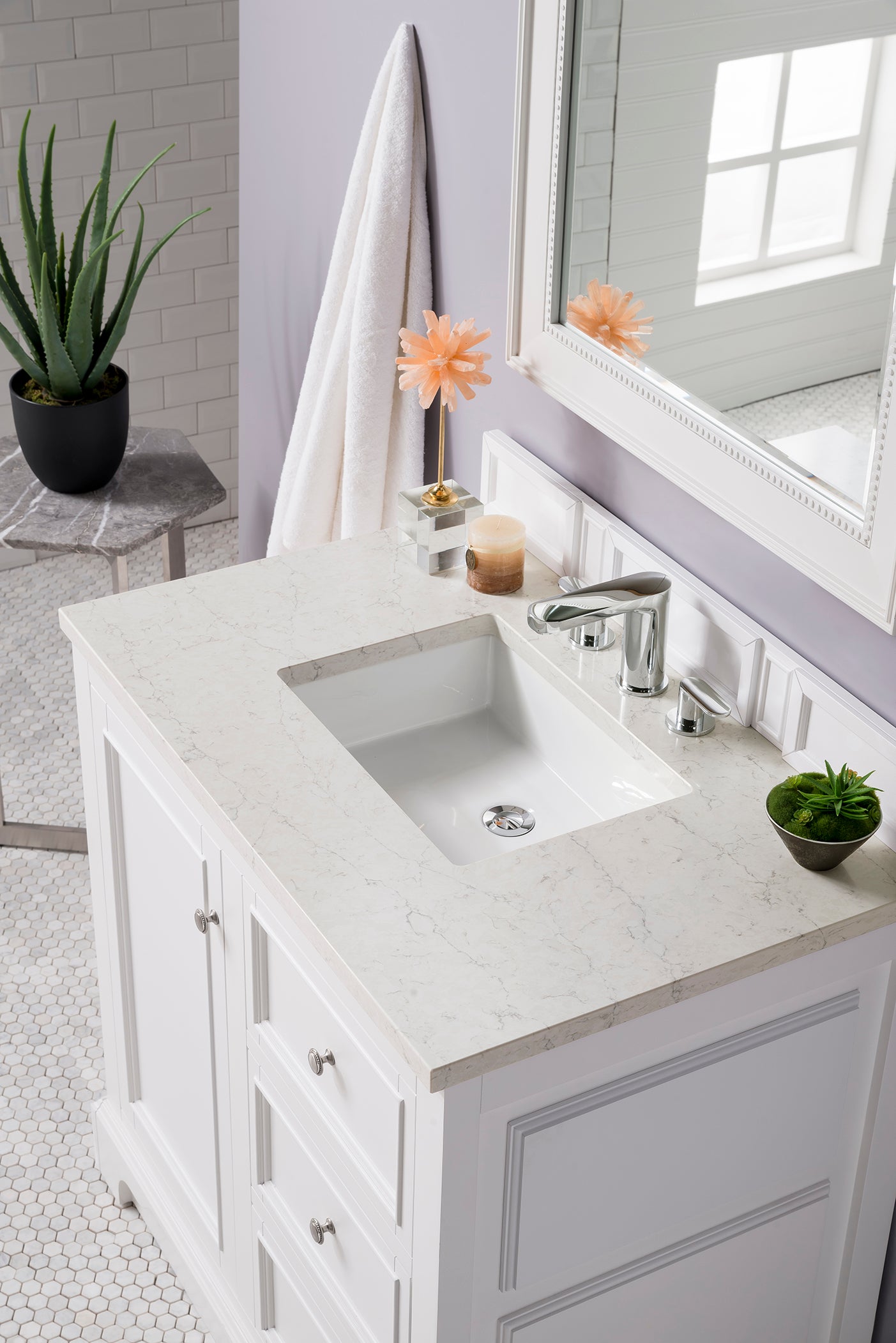 The De Soto 36" Bright White Single Vanity was designed to fulfill a wide range of tasks. Storage and convenience are foremost in this collection. The De Soto series provides ample storage in each of the six available widths and configurations. Cabinets are crafted from North American yellow poplar hardwoods and veneers. Low maintenance is provided with the full plinth base located behind the rounded bracket feet. Premium features in this series include an electrical and USB outlet and beautiful faux-shagreen drawer organizers. Optional wood backsplash included. The look is completed with a 3 CM eased edge Eternal Pearl Jasmine Silestone top with one white ceramic rectangular sink.