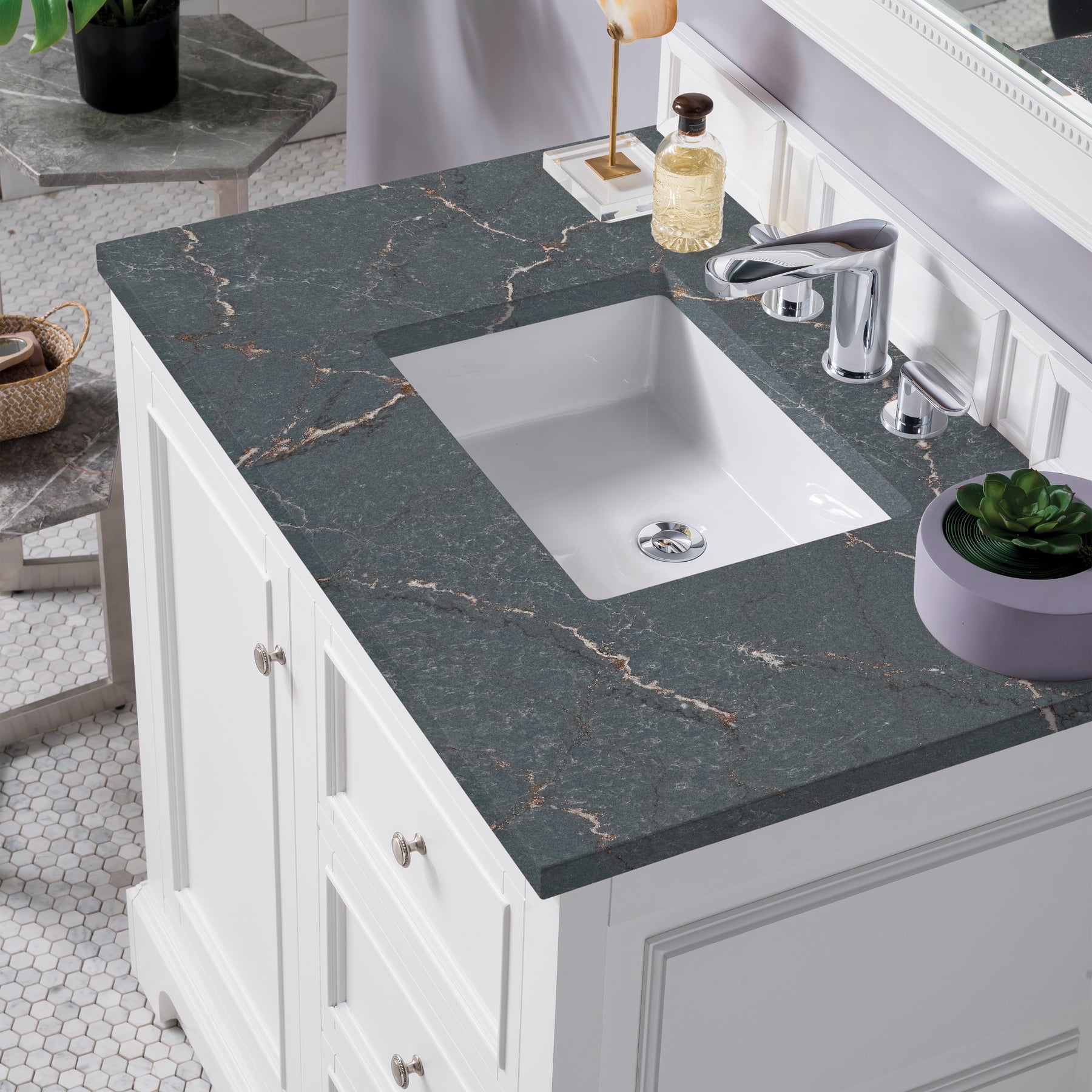 The De Soto 36" Bright White Single Vanity was designed to fulfill a wide range of tasks. Storage and convenience are foremost in this collection. The De Soto series provides ample storage in each of the six available widths and configurations. Cabinets are crafted from North American yellow Poplar hardwoods and veneers. Low maintenance is provided with the full plinth base located behind the rounded bracket feet. Premium features in this series include an electrical and USB outlet and beautiful faux-shagreen drawer organizers. Optional wood backsplash included. Adding an elegant contrast to the Bright White finish is the Parisien Bleu Silestone top, offering a deep bluish hue with broad and intricate neutral veins highlighted by fine coppery accents which perfectly complete this beautiful vanity.