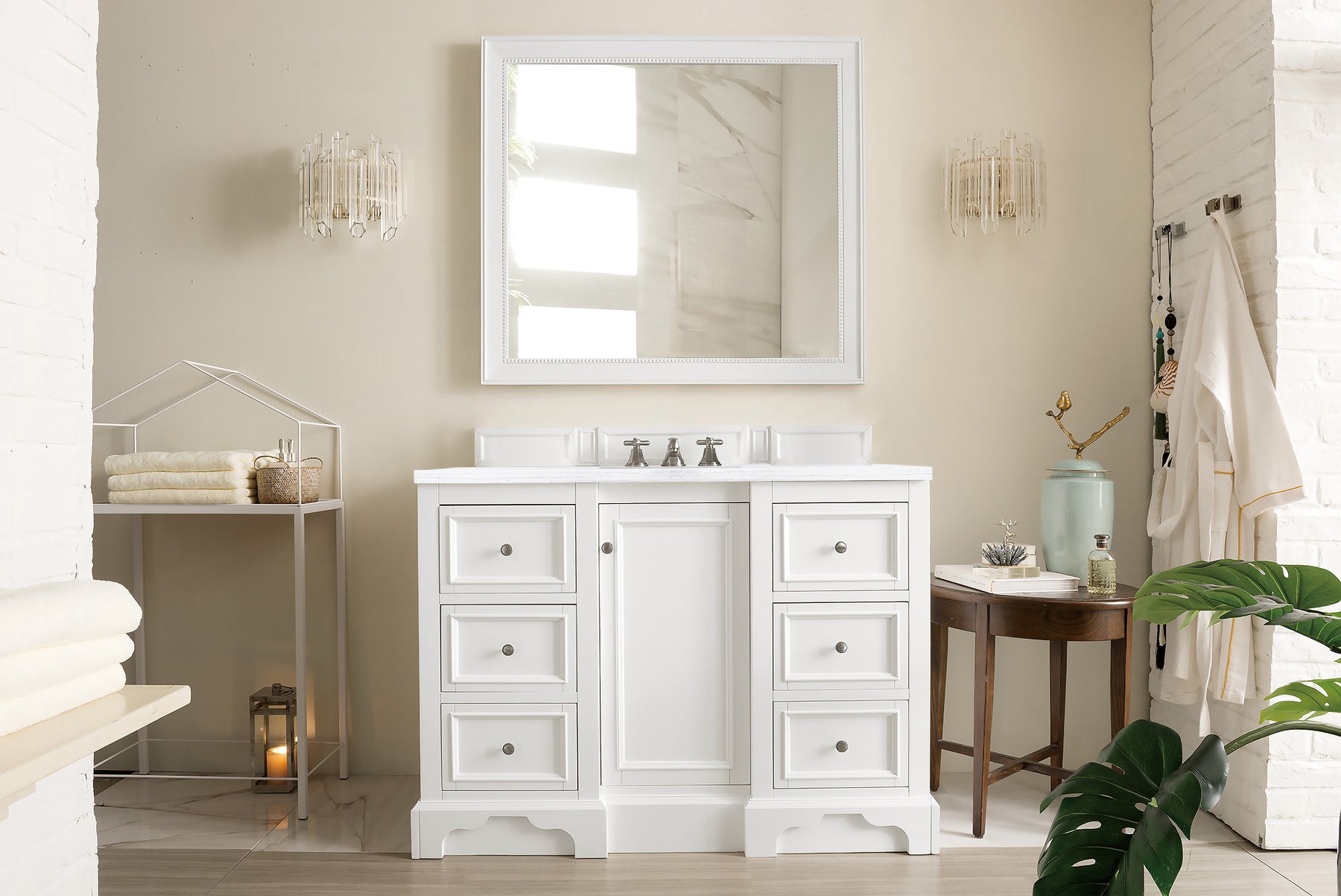 The De Soto 46" Bright White Single Vanity was designed to fulfill a wide range of tasks. Storage and convenience are foremost in this collection. The De Soto series provides ample storage in each of the six available widths and configurations. Cabinets are crafted from North American yellow poplar hardwoods and veneers. Low maintenance is provided with the full plinth base located behind the rounded bracket feet. Premium features in this series include an electrical and USB outlet and beautiful faux-shagreen drawer organizers. Optional wood backsplash included. The look is completed with a 3 CM eased edge Arctic Fall Solid Surface top with one white ceramic rectangular sink.