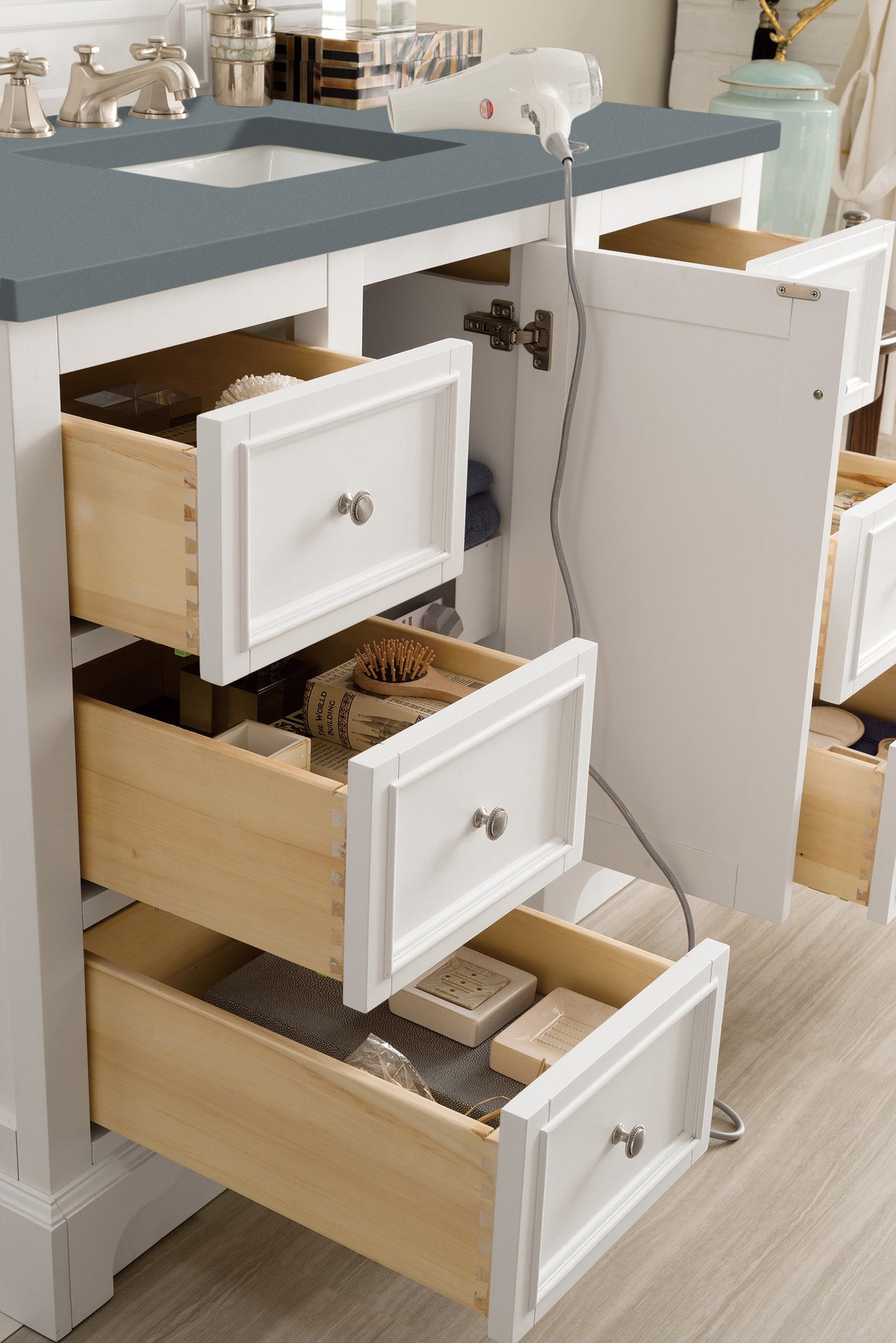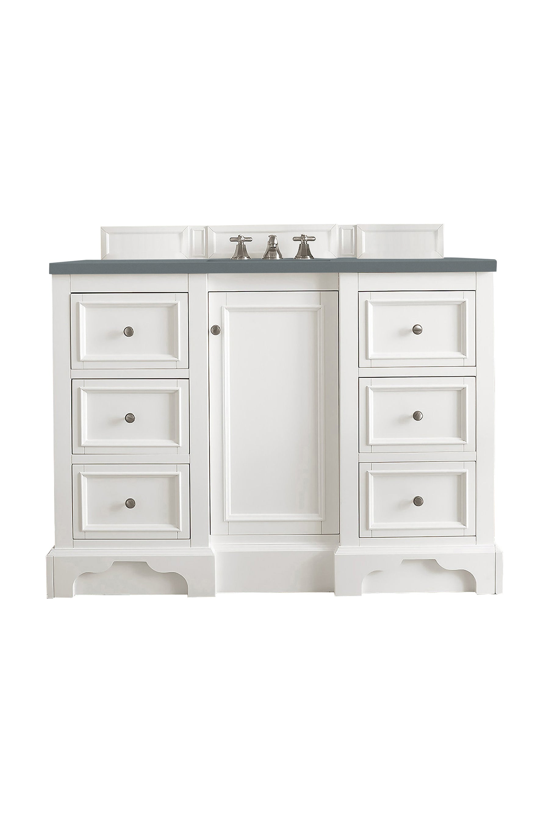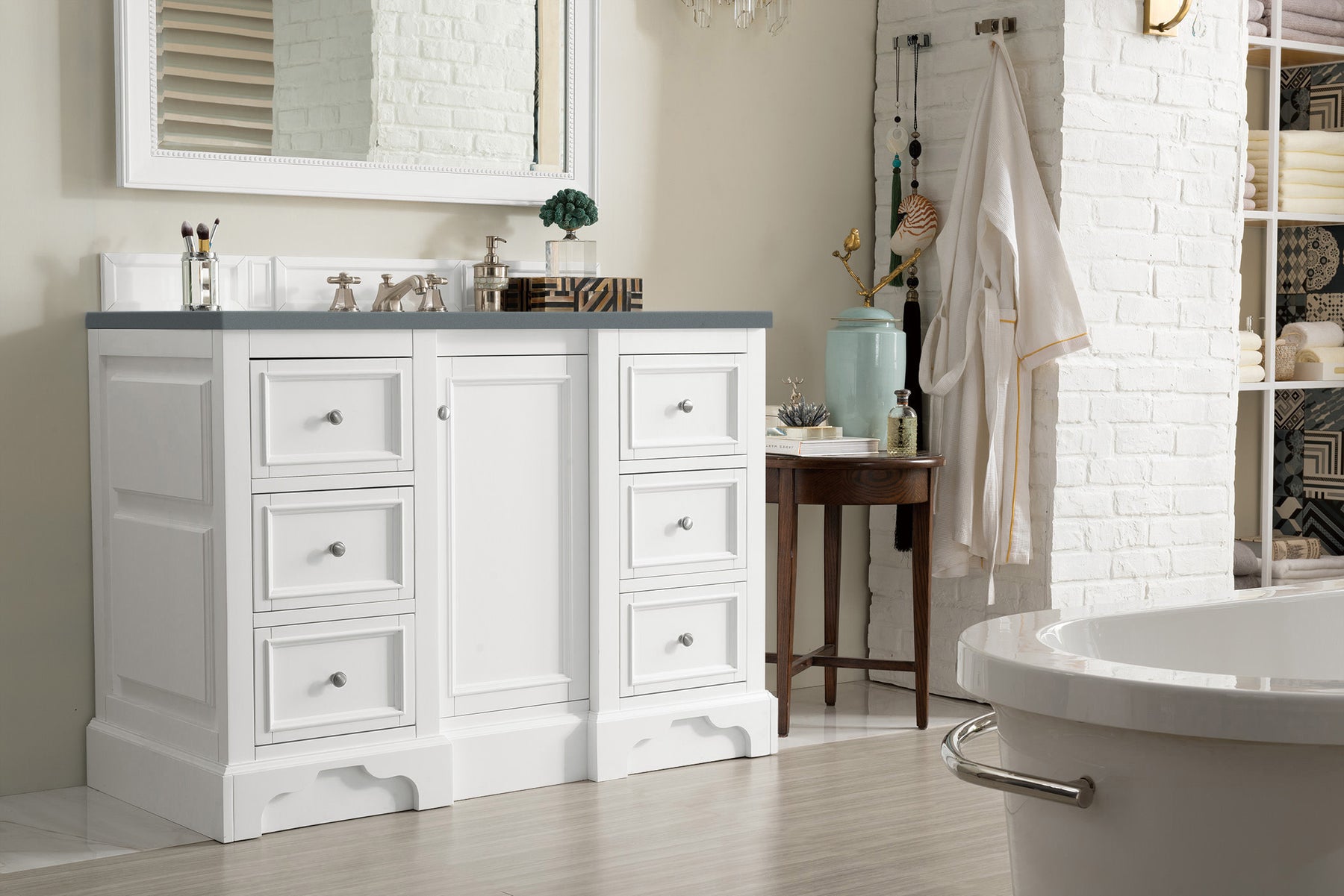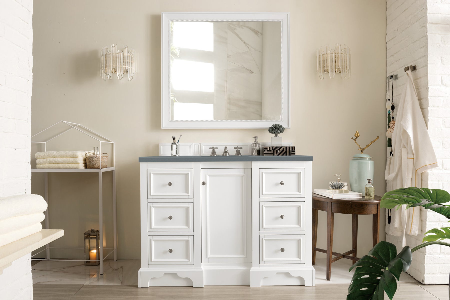 The De Soto 46" Bright White Single Vanity was designed to fulfill a wide range of tasks. Storage and convenience are foremost in this collection. The De Soto series provides ample storage in each of the six available widths and configurations. Cabinets are crafted from North American yellow poplar hardwoods and veneers. Low maintenance is provided with the full plinth base located behind the rounded bracket feet. Premium features in this series include an electrical and USB outlet and beautiful faux-shagreen drawer organizers. Optional wood backsplash included. The look is completed with a 3 CM eased edge Cala Blue Silestone top with one white ceramic rectangular sink.