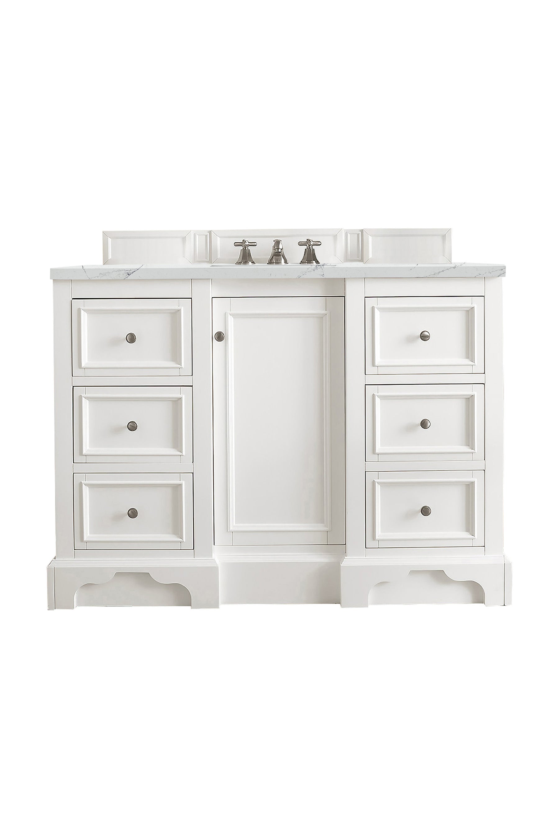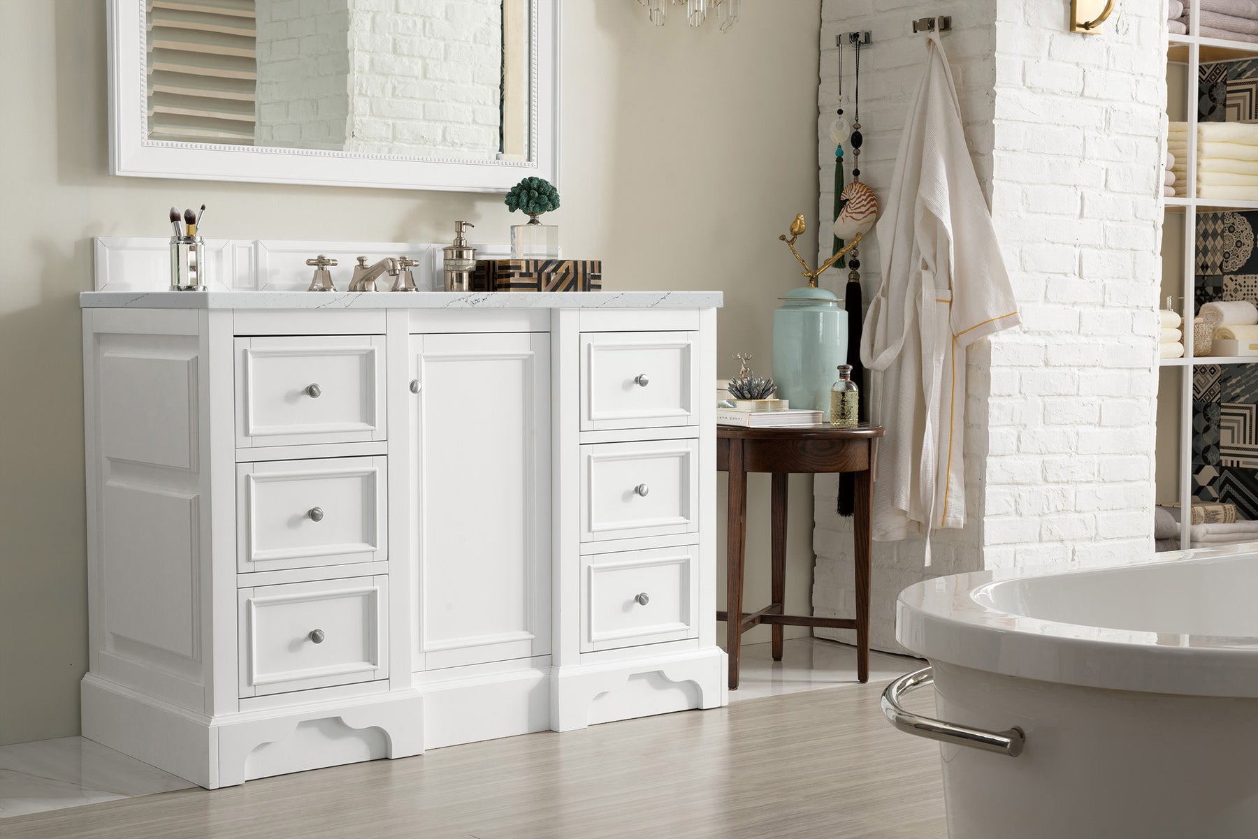 The De Soto 46" Bright White Single Vanity was designed to fulfill a wide range of tasks. Storage and convenience are foremost in this collection. The De Soto series provides ample storage in each of the six available widths and configurations. Cabinets are crafted from North American yellow poplar hardwoods and veneers. Low maintenance is provided with the full plinth base located behind the rounded bracket feet. Premium features in this series include an electrical and USB outlet and beautiful faux-shagreen drawer organizers. Optional wood backsplash included. The look is completed with a 3 CM eased edge Ethereal Noctis Silestone top with two white ceramic rectangular sinks.