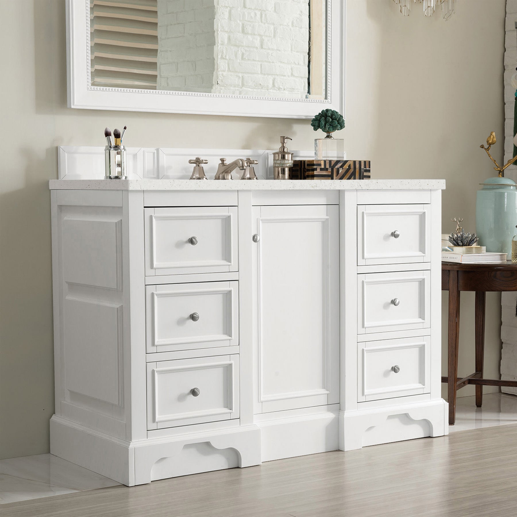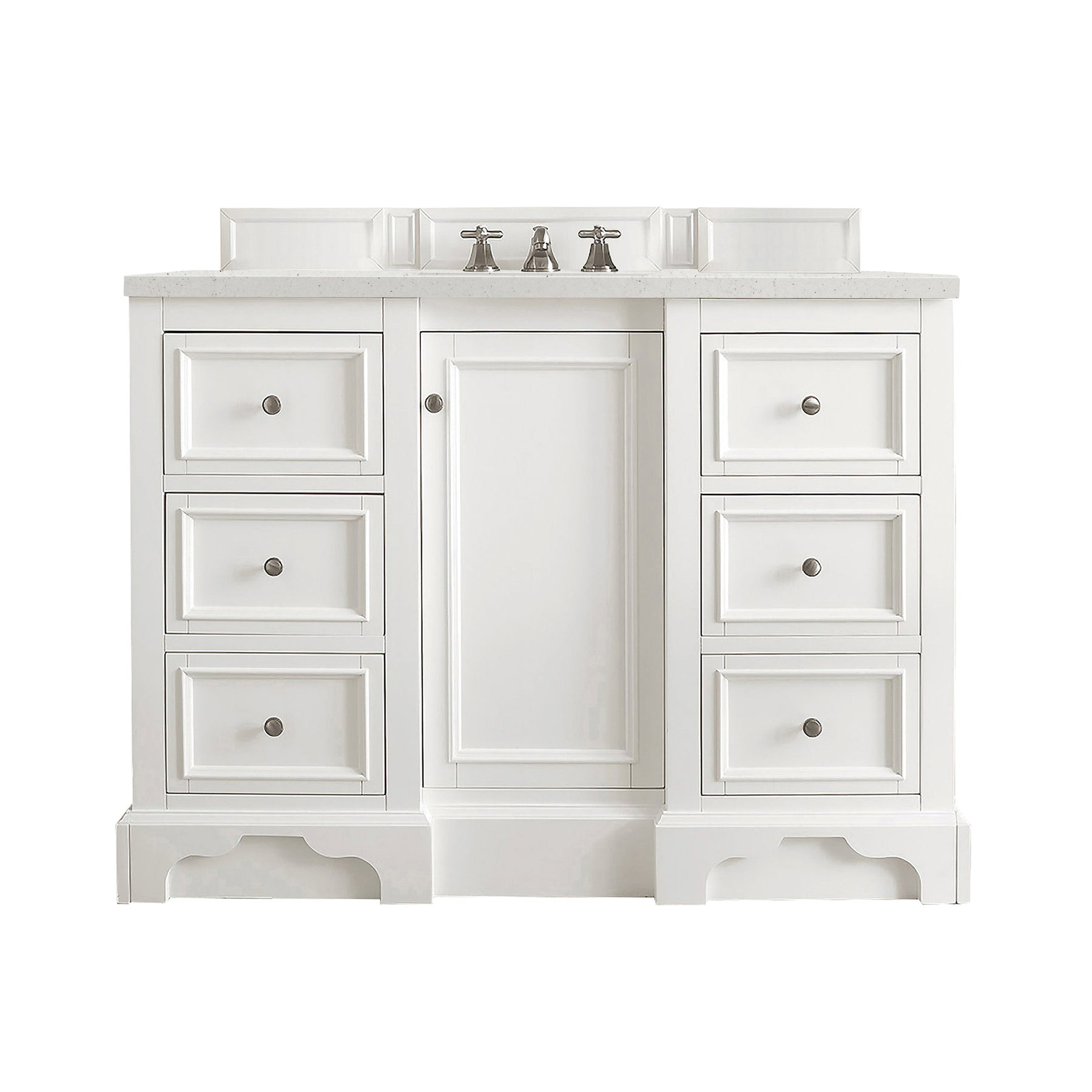 The De Soto 48" Bright White Single Vanity was designed to fulfill a wide range of tasks. Storage and convenience are foremost in this collection. The De Soto series provides ample storage in each of the six available widths and configurations. Cabinets are crafted from North American yellow Poplar hardwoods and veneers. Low maintenance is provided with the full plinth base located behind the rounded bracket feet. Premium features in this series include an electrical and USB outlet and beautiful faux-shagreen drawer organizers. Adding an elegant contrast to the Bright White finish, the Lime Delight Silestone top lends warm, textured beige tones to perfectly complement the design of the vanity.