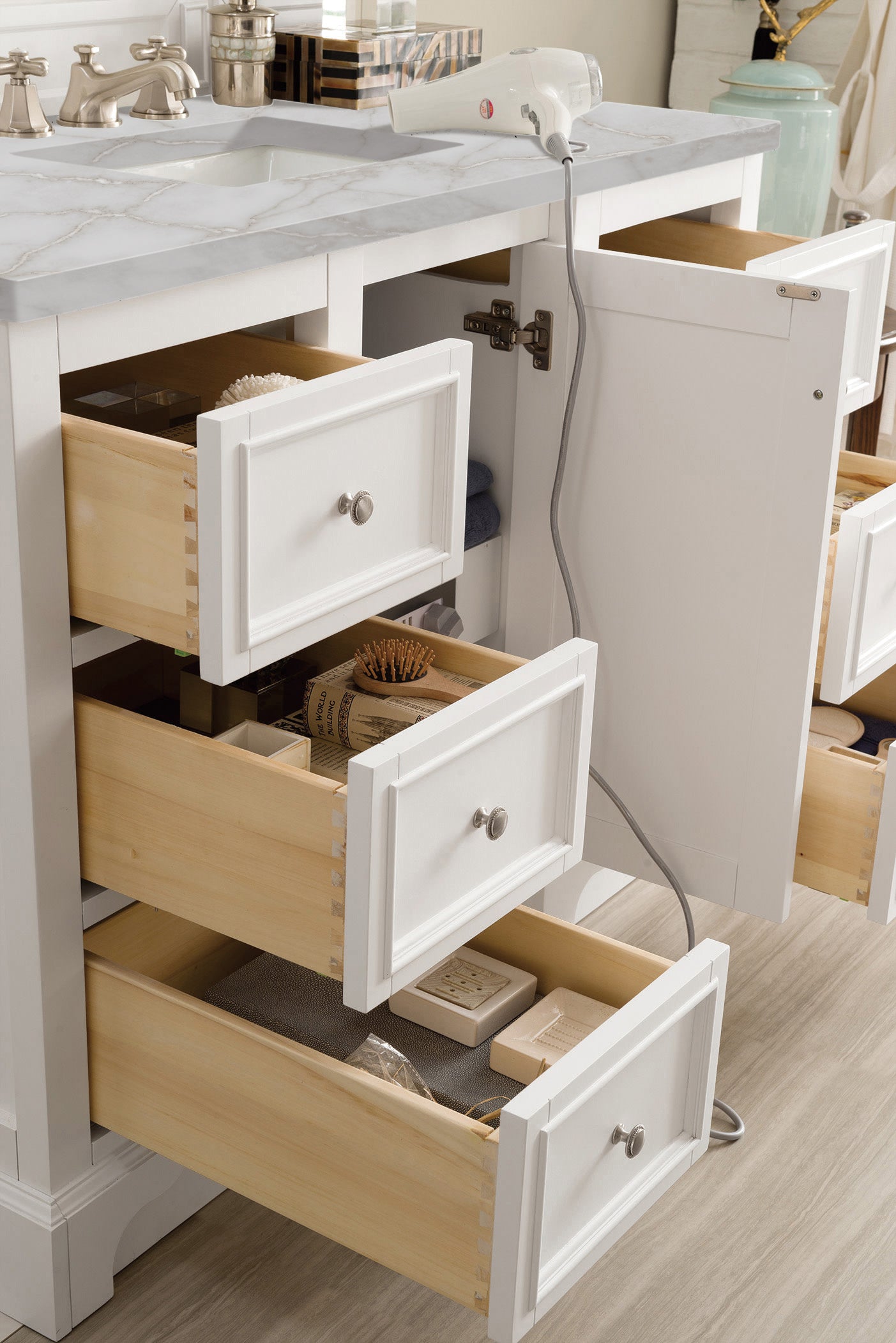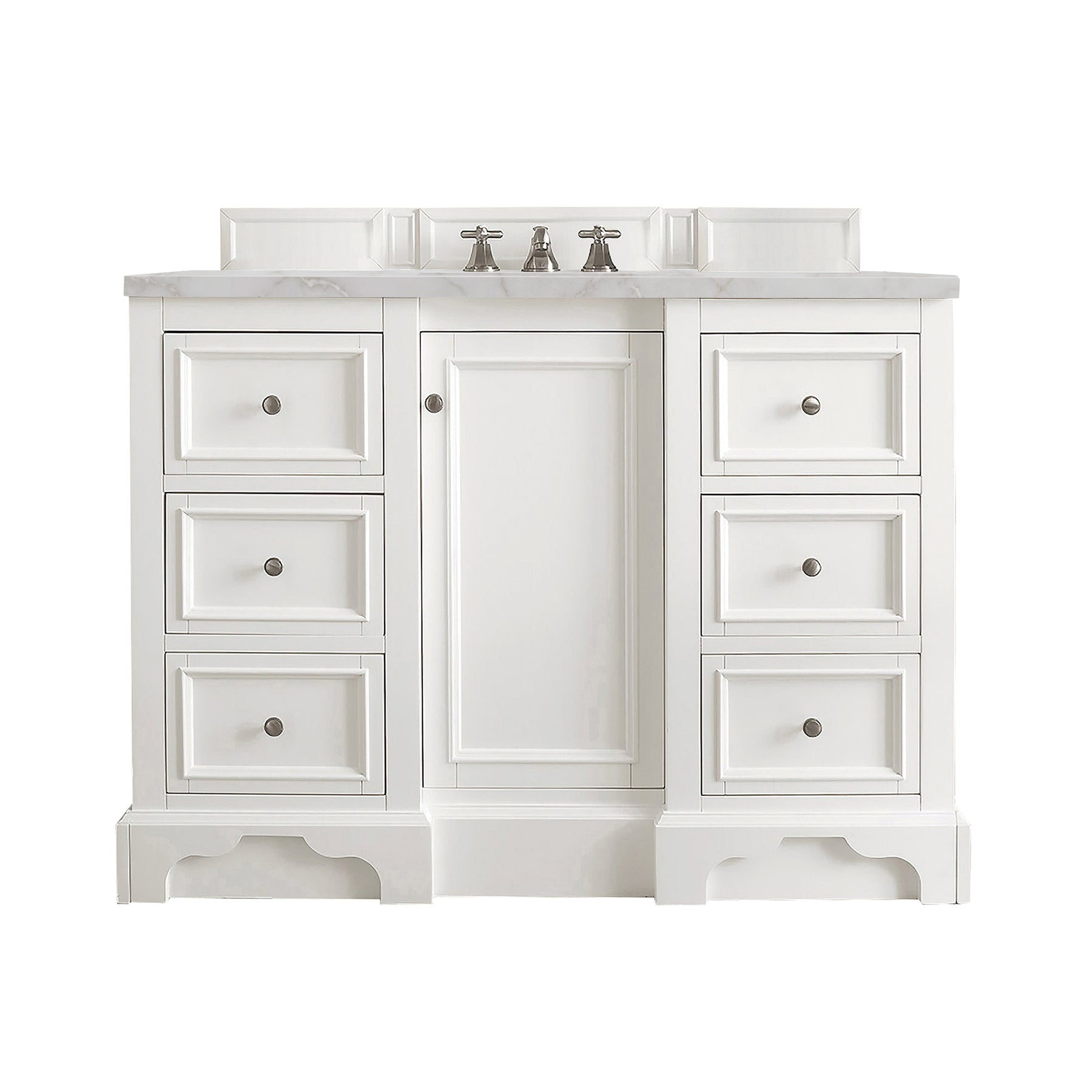 The De Soto 48" Bright White Single Vanity was designed to fulfill a wide range of tasks. Storage and convenience are foremost in this collection. The De Soto series provides ample storage in each of the six available widths and configurations. Cabinets are crafted from North American yellow Poplar hardwoods and veneers. Low maintenance is provided with the full plinth base located behind the rounded bracket feet. Premium features in this series include an electrical and USB outlet and beautiful faux-shagreen drawer organizers. The Bright White finish is accented by the neutral background of the Victorian Silver Silestone top, boasting champagne metallic accents which seamlessly complete the look.