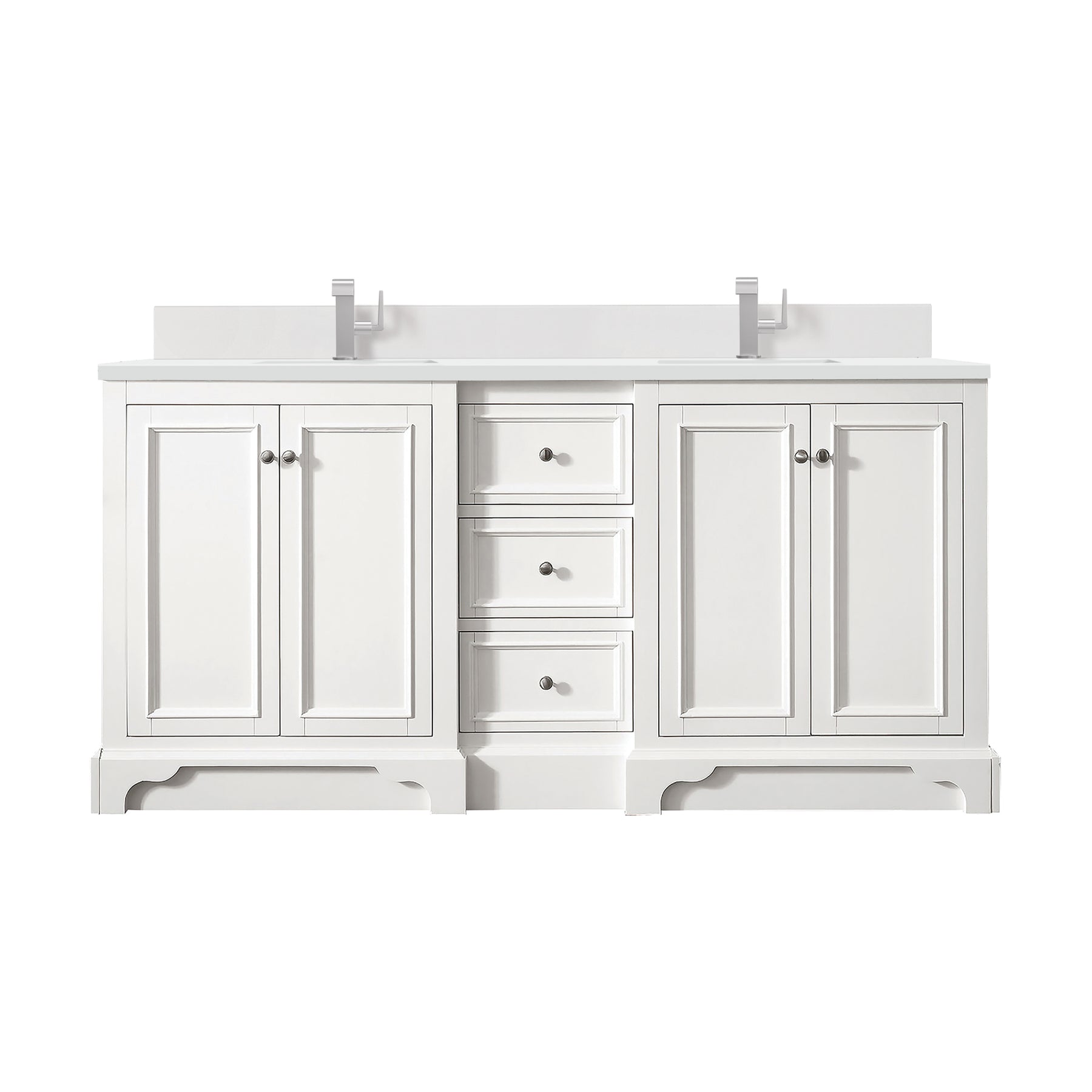 The De Soto 72" Bright White Double Vanity was designed to fulfill a wide range of tasks. Storage and convenience are foremost in this collection. The De Soto series provides ample storage in each of the six available widths and configurations. Cabinets are crafted from North American yellow Poplar hardwoods and veneers. Low maintenance is provided with the full plinth base located behind the rounded bracket feet. Premium features in this series include an electrical and USB outlet and beautiful faux-shagreen drawer organizers. The timeless, White Zeus Silestone top and backsplash provides a contemporary touch, or choose to use the top with included wood backsplash.