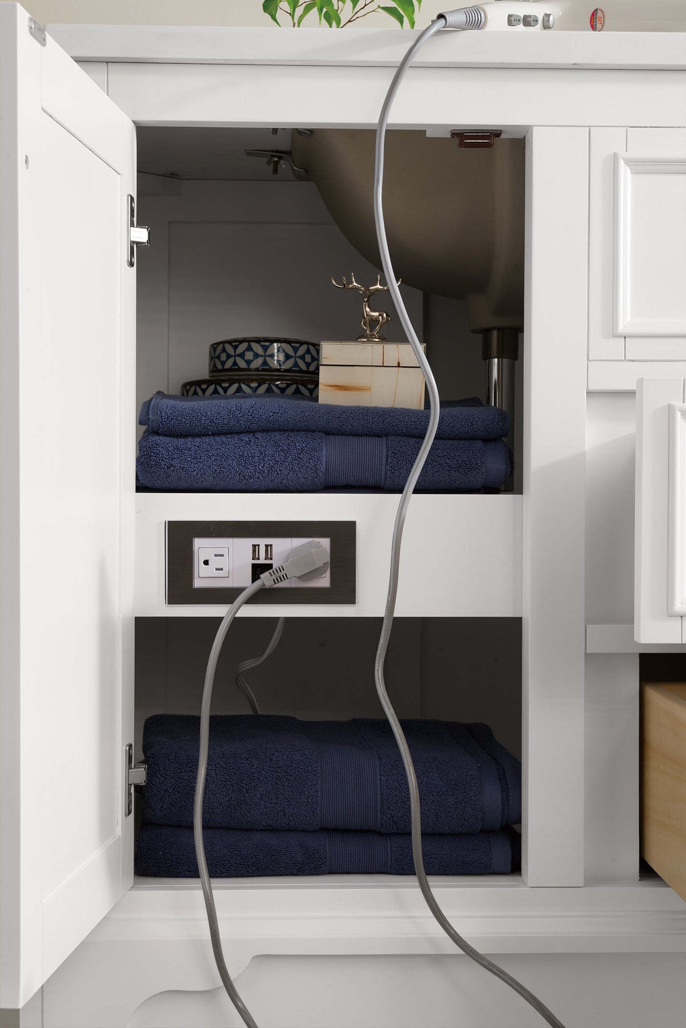 The De Soto 94" Bright White Double Vanity Set by James Martin Vanities features two 36" cabinets connected by a matching 22" make-up counter. The cabinet includes one faux shagreen drawer organizer and interior shelf space. This cabinet also includes a decorative wood backsplash. The look is completed with a 3 CM eased edge Arctic Fall Solid Surface top and two white ceramic rectangular sinks.