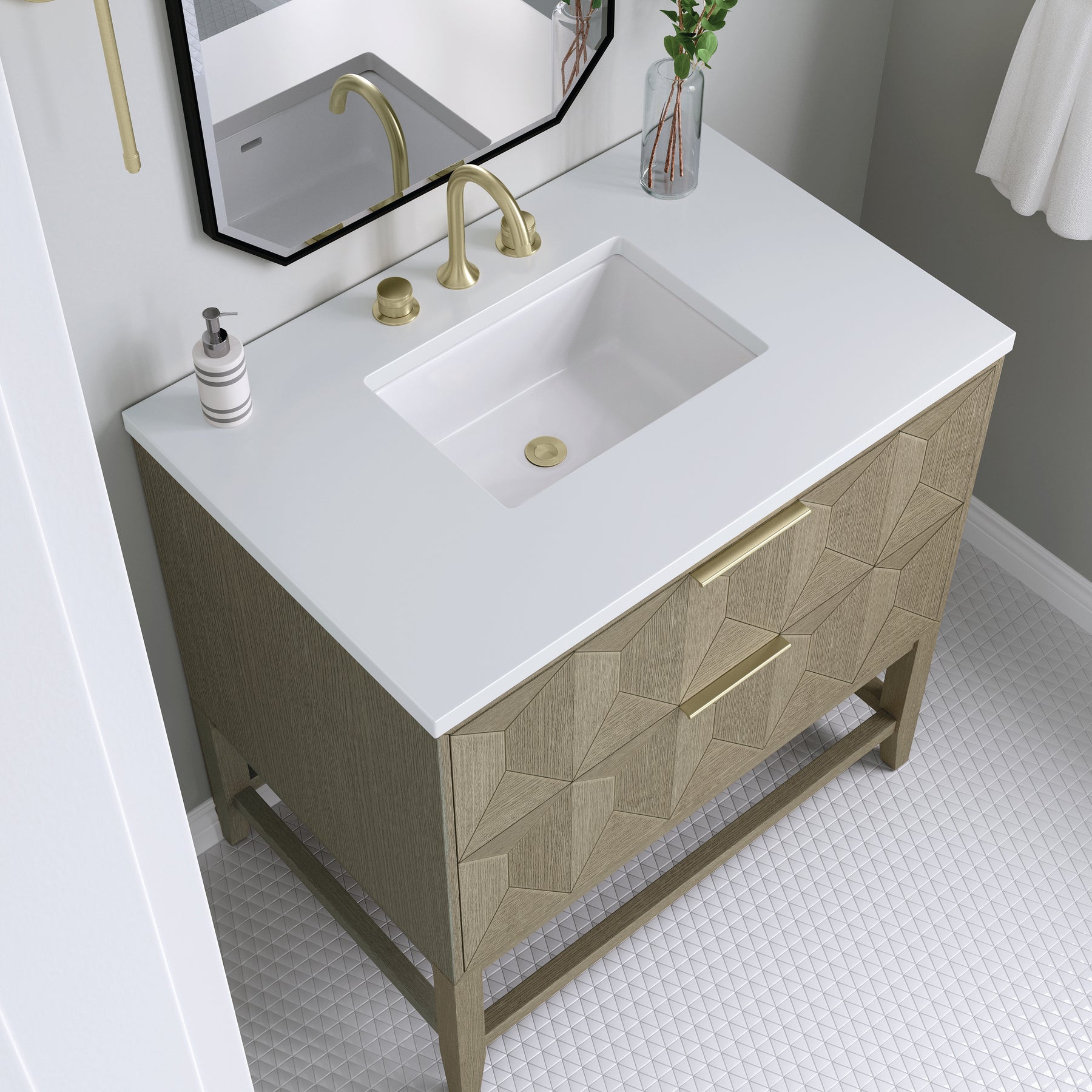 Inspired by today's modern furnishings, characterized by clean lines juxtaposed with unexpected artisan details, the 36" Emmeline creates a bold statement. A solid Ash wood base frame supports a faceted front Vanity Cabinet featuring two spacious drawers lined with an aluminum laminate surface. The lightly wire-brushed Ash veneer in a Pebble Oak finish adds authentic drama, allowing this vanity to work into any bath space. Adding an elegant contrast to the rich wood and Champagne Brass hardware, the 3 cm White Zeus Silestone top by Cosentino is perfect for those who love to innovate without giving up the traditional look and style.