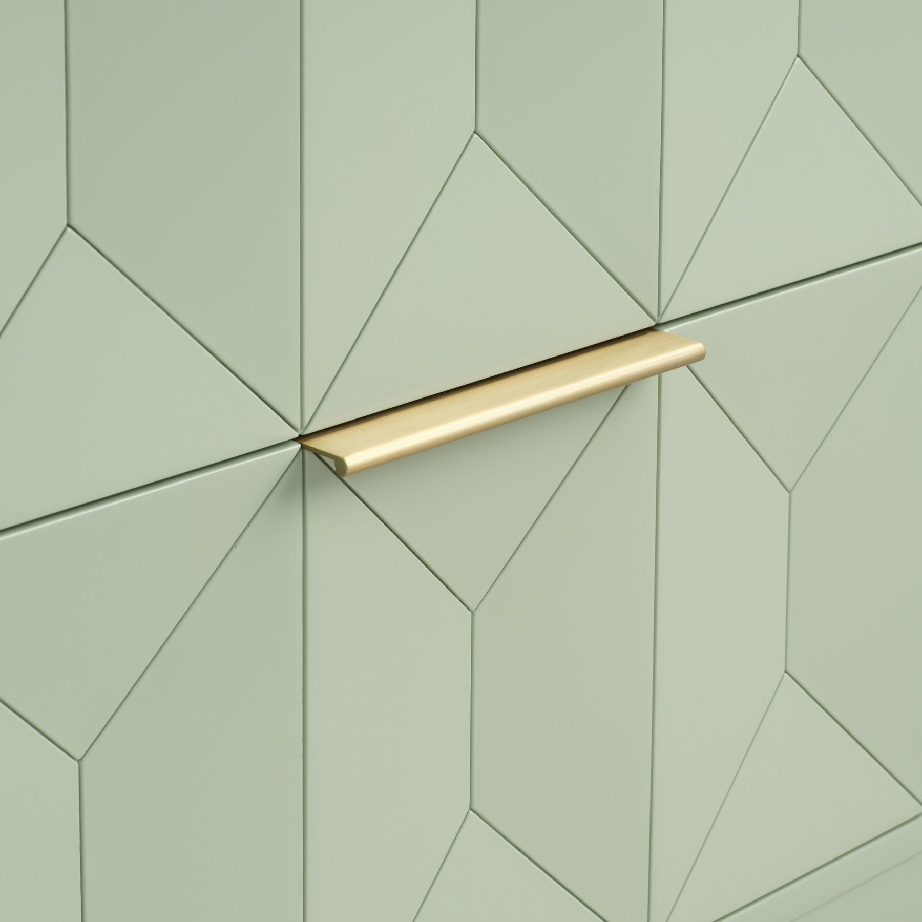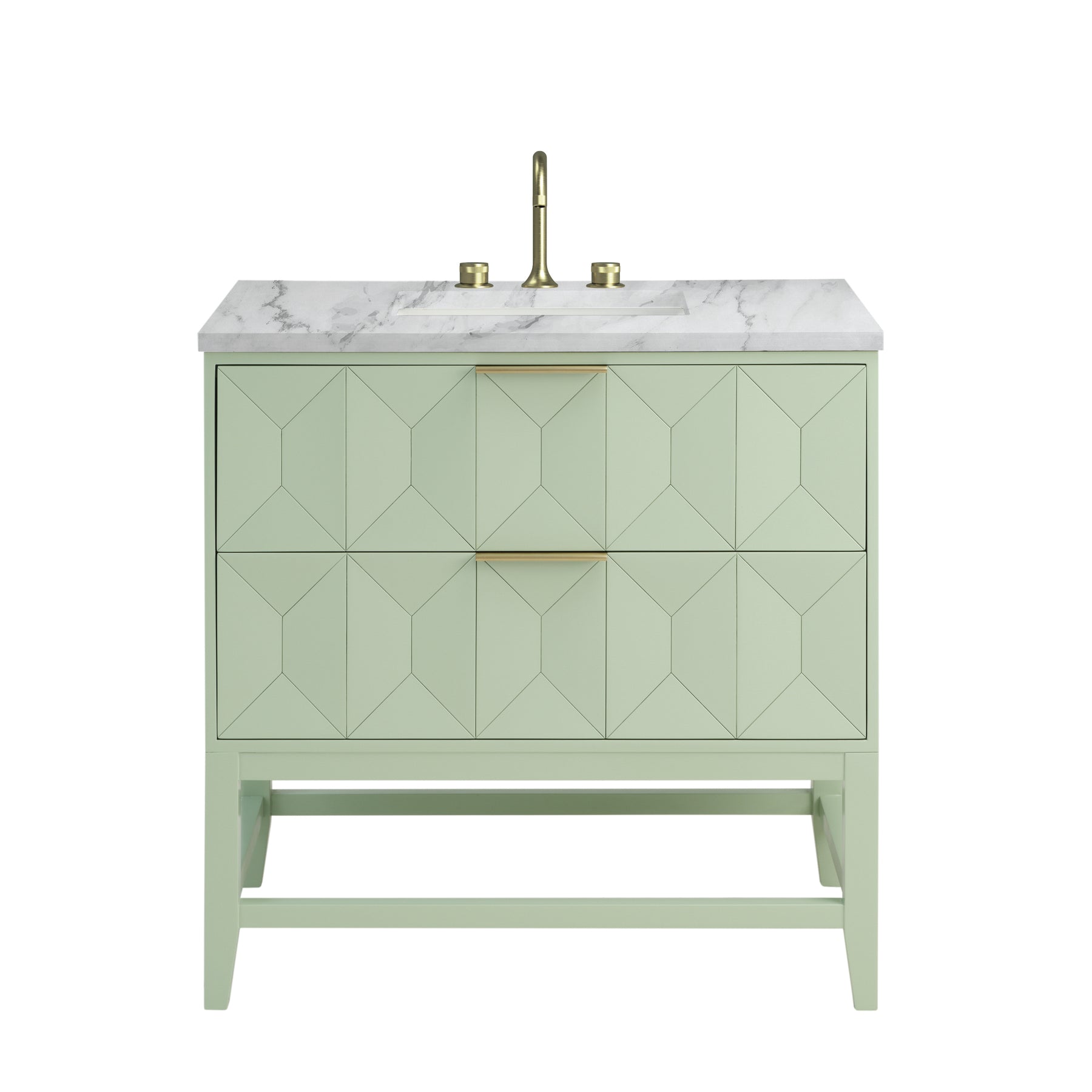 The Emmeline 36" Single Vanity by James Martin Vanities makes a bold statement with its charming Pistachio finish and dramatic, faceted drawer fronts. Inspired by modern furnishings and characterized by clean lines juxtaposed with unexpected artisan details, the Emmeline boasts a solid Beech wood frame and two full-extension drawers lined with our signature aluminum laminate for easy cleaning. A finish-matched drawer organizer and tab-style pulls in Champagne Brass add the finishing touches to this vanity. The addition of a beautiful Eternal Jasmine Pearl Silestone® top with undermount sink completes the look.