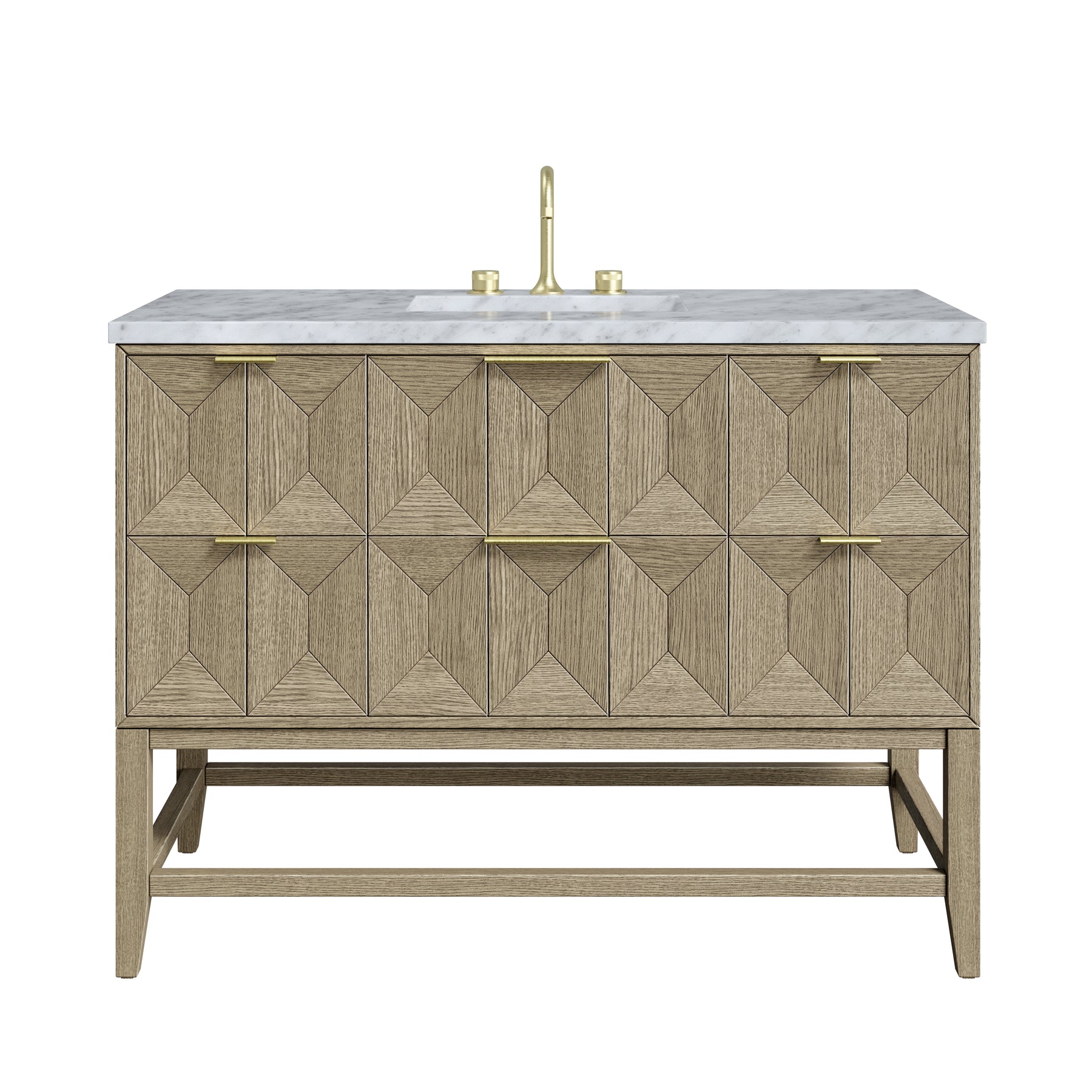 Inspired by today's modern furnishings, characterized by clean lines juxtaposed with unexpected artisan details, the 48" Emmeline creates a bold statement. A solid Ash wood base frame supports a faceted front vanity cabinet featuring five spacious drawers lined with a brushed aluminum laminate. The lightly wire-brushed Ash veneer in a Pebble Oak finish adds authentic drama, allowing this vanity to work into any bath space. The Champagne Brass tab-style hardware adds a layer of sophistication. Completing this vanity, are the treasured, neutral tones and textures of the Carrara marble vanity top display an white background with delicate grey veining.
