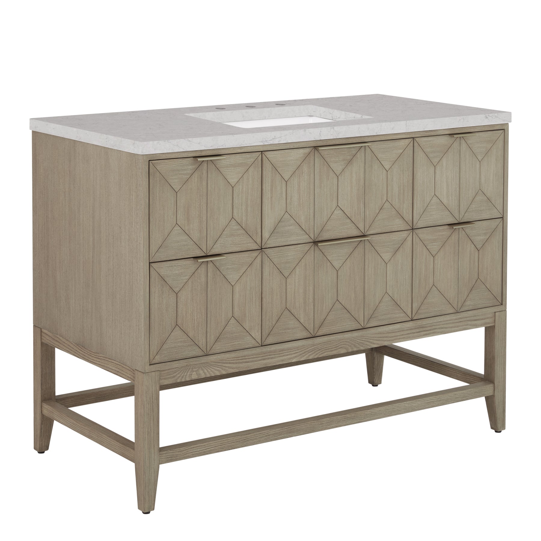 Inspired by today's modern furnishings, characterized by clean lines juxtaposed with unexpected artisan details, the 48" Emmeline creates a bold statement. A solid Ash wood base frame supports a faceted front vanity cabinet featuring five spacious drawers lined with a brushed aluminum laminate. The lightly wire-brushed Ash veneer in a Pebble Oak finish adds authentic drama, allowing this vanity to work into any bath space. The Champagne Brass tab-style hardware adds a layer of sophistication. Completing the look is the Eternal Jasmine Pearl Silestone top by Cosentino, featuring an elegant white background with subtle marbleized swirls and dark blue-gray veining patterns.