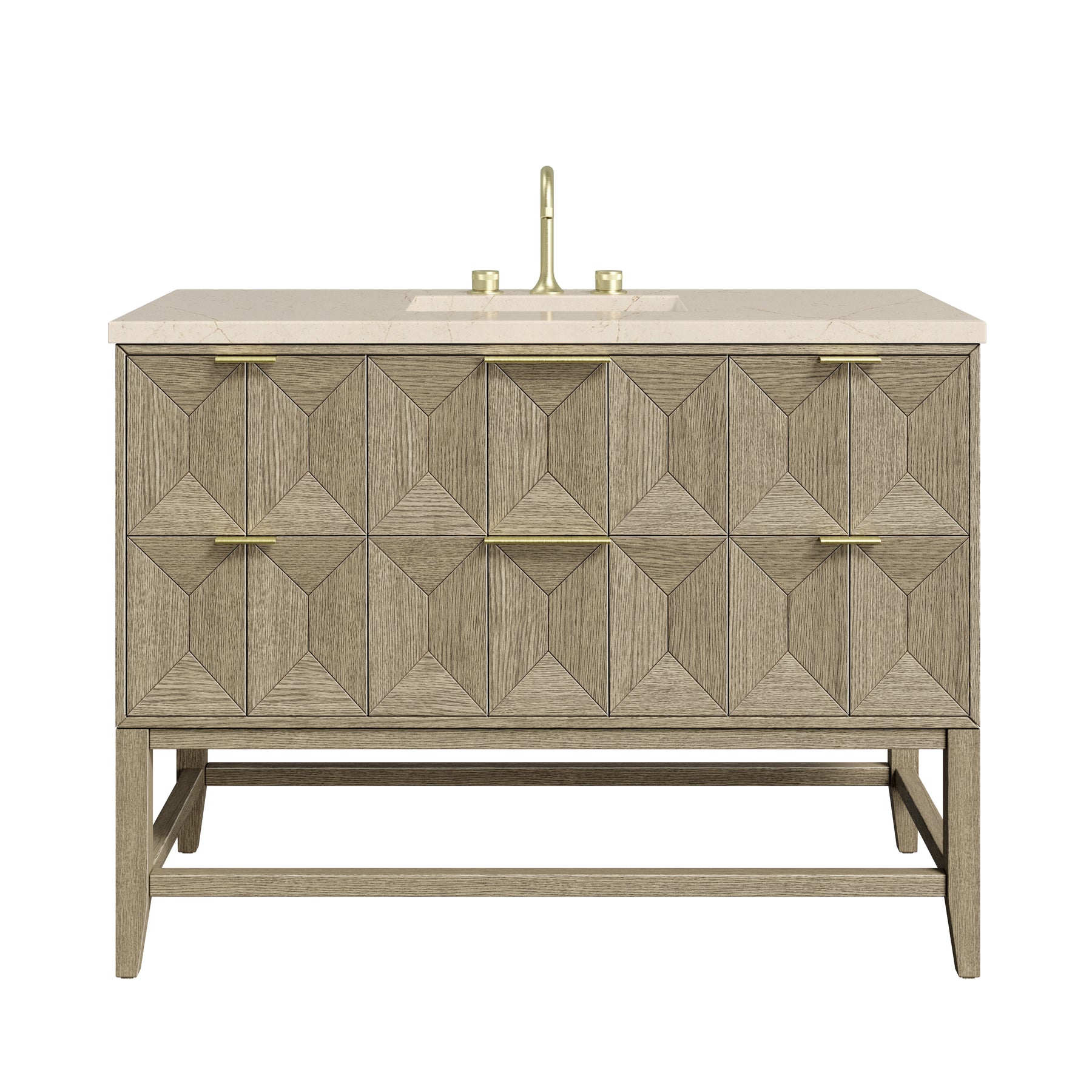 Inspired by today's modern furnishings, characterized by clean lines juxtaposed with unexpected artisan details, the 48" Emmeline creates a bold statement. A solid Ash wood base frame supports a faceted front vanity cabinet featuring five spacious drawers lined with a brushed aluminum laminate. The lightly wire-brushed Ash veneer in a Pebble Oak finish adds authentic drama, allowing this vanity to work into any bath space. The Champagne Brass tab-style hardware adds a layer of sophistication. The classic, warm tones of the Eternal Marfil Silestone top by Cosentino provide an elegant contrast to the modern Pebble Oak finish.
