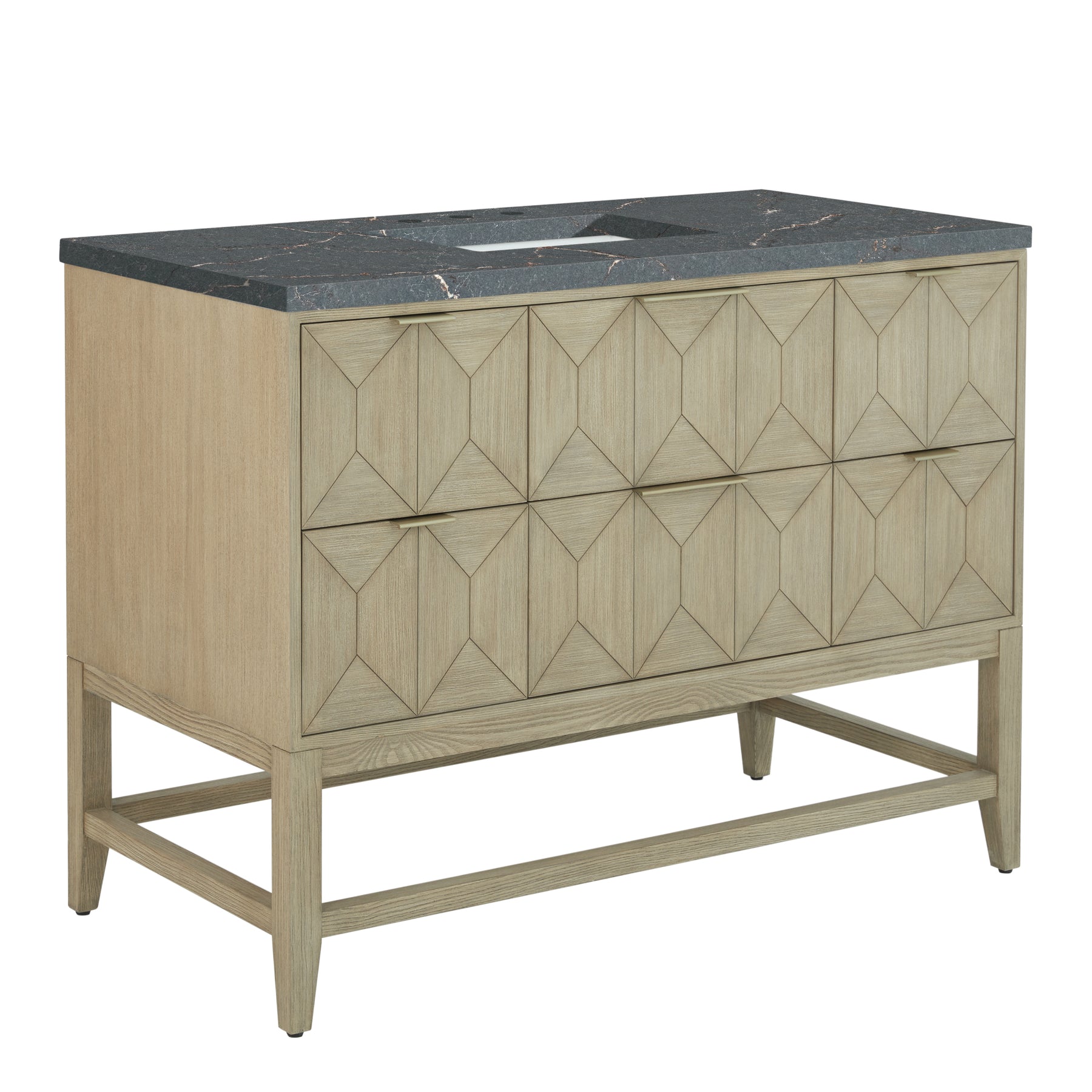 Inspired by today's modern furnishings, characterized by clean lines juxtaposed with unexpected artisan details, the 48" Emmeline creates a bold statement. A solid Ash wood base frame supports a faceted front vanity cabinet featuring five spacious drawers lined with a brushed aluminum laminate. The lightly wire-brushed Ash veneer in a Pebble Oak finish adds authentic drama, allowing this vanity to work into any bath space. The Champagne Brass tab-style hardware adds a layer of sophistication. The finish and hardware accents are enhanced by the Parisien Blue Silestone top, offering a deep bluish hue with broad and intricate neutral veins highlighted by fine coppery accents.