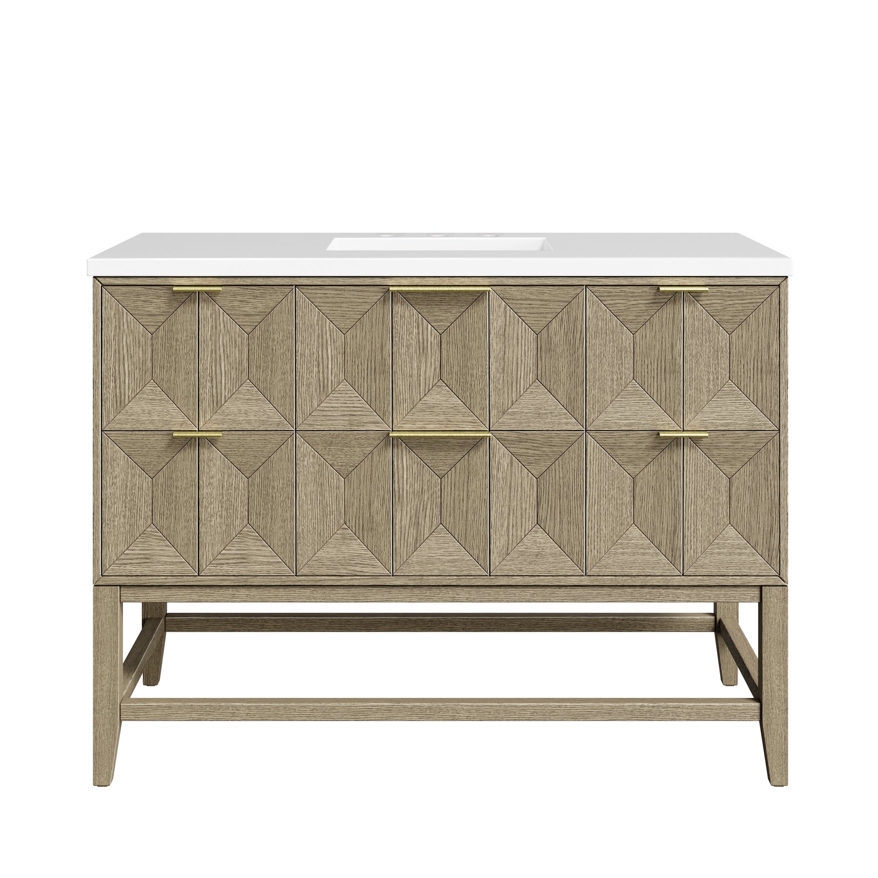 Inspired by today's modern furnishings, characterized by clean lines juxtaposed with unexpected artisan details, the 48" Emmeline creates a bold statement. A solid Ash wood base frame supports a faceted front vanity cabinet featuring five spacious drawers lined with a brushed aluminum laminate. The lightly wire-brushed Ash veneer in a Pebble Oak finish adds authentic drama, allowing this vanity to work into any bath space. The Champagne Brass tab-style hardware adds a layer of sophistication. The White Zeus Silestone top by Cosentino is perfect for those who love to innovate without giving up the traditional look and style.