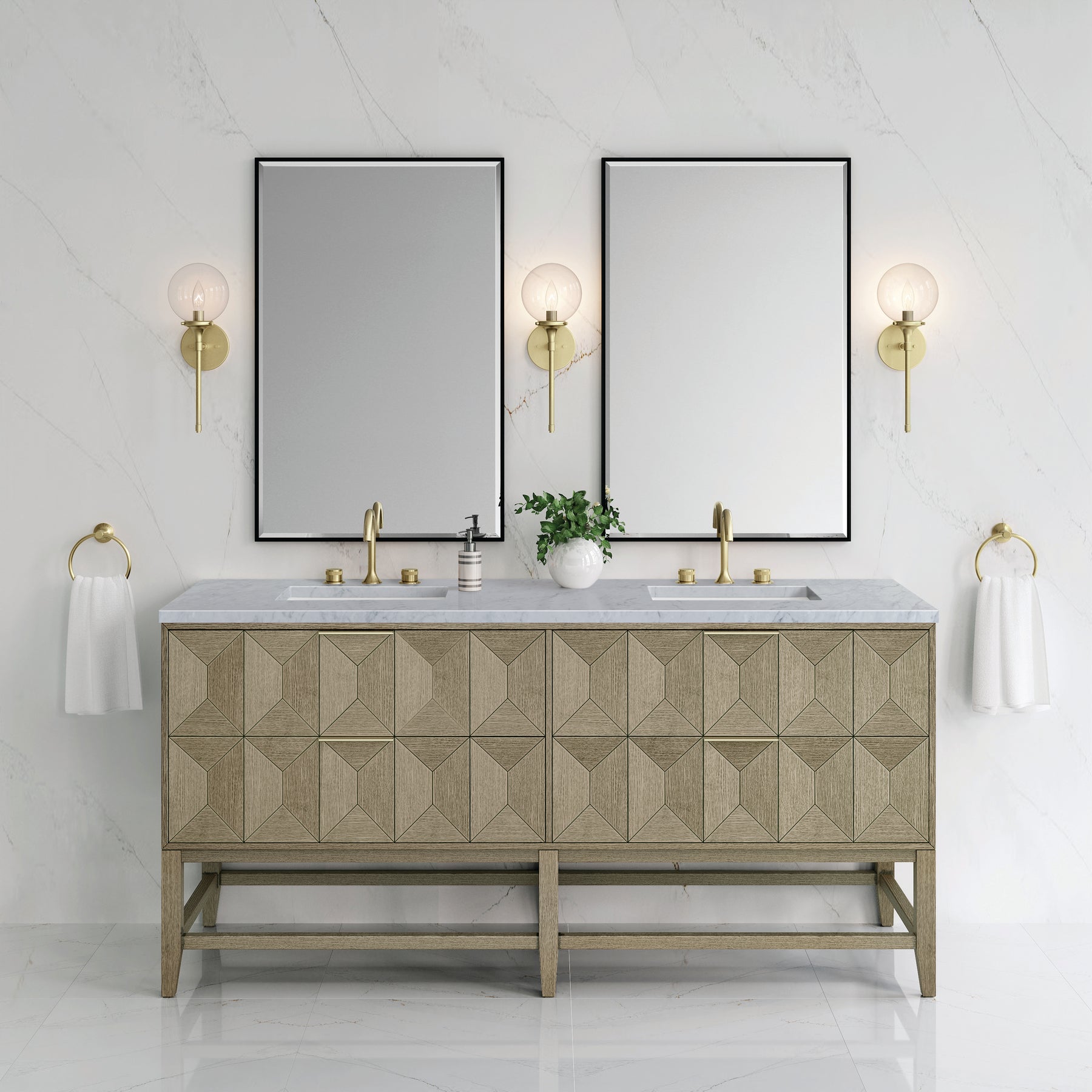 Inspired by today's modern furnishings, characterized by clean lines juxtaposed with unexpected artisan details, the 72" Emmeline creates a bold statement. A solid Ash wood base frame supports a faceted front Vanity Cabinet featuring four spacious drawers lined with an aluminum laminate surface. The lightly wire-brushed Ash veneer in a Pebble Oak finish adds authentic drama, allowing this vanity to work into any bath space. The treasured, neutral tones and textures of the Carrara marble vanity top display a white background with delicate grey veining.