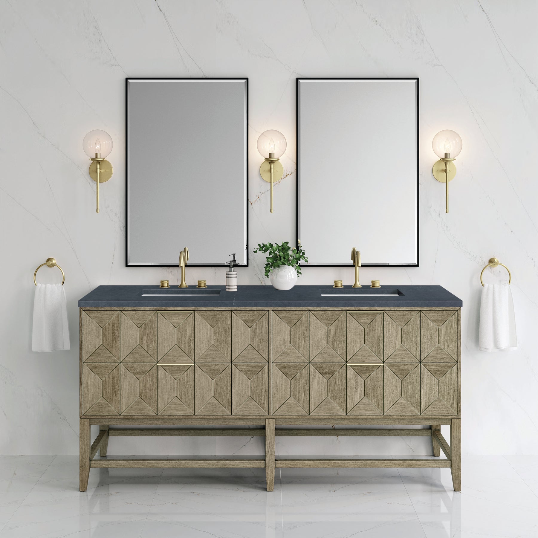 Inspired by today's modern furnishings, characterized by clean lines juxtaposed with unexpected artisan details, the 72" Emmeline creates a bold statement. A solid Ash wood base frame supports a faceted front Vanity Cabinet featuring four spacious drawers lined with an aluminum laminate surface. The lightly wire-brushed Ash veneer in a Pebble Oak finish adds authentic drama, allowing this vanity to work into any bath space. A spectacular top characterized by depth and a sense of movement with a suede finish, the Charcoal Soapstone Silestone top by Cosentino has the new n-boost technology, which helps prevent the adhesion of liquids, enhances shine, and intensifies the color of this top.