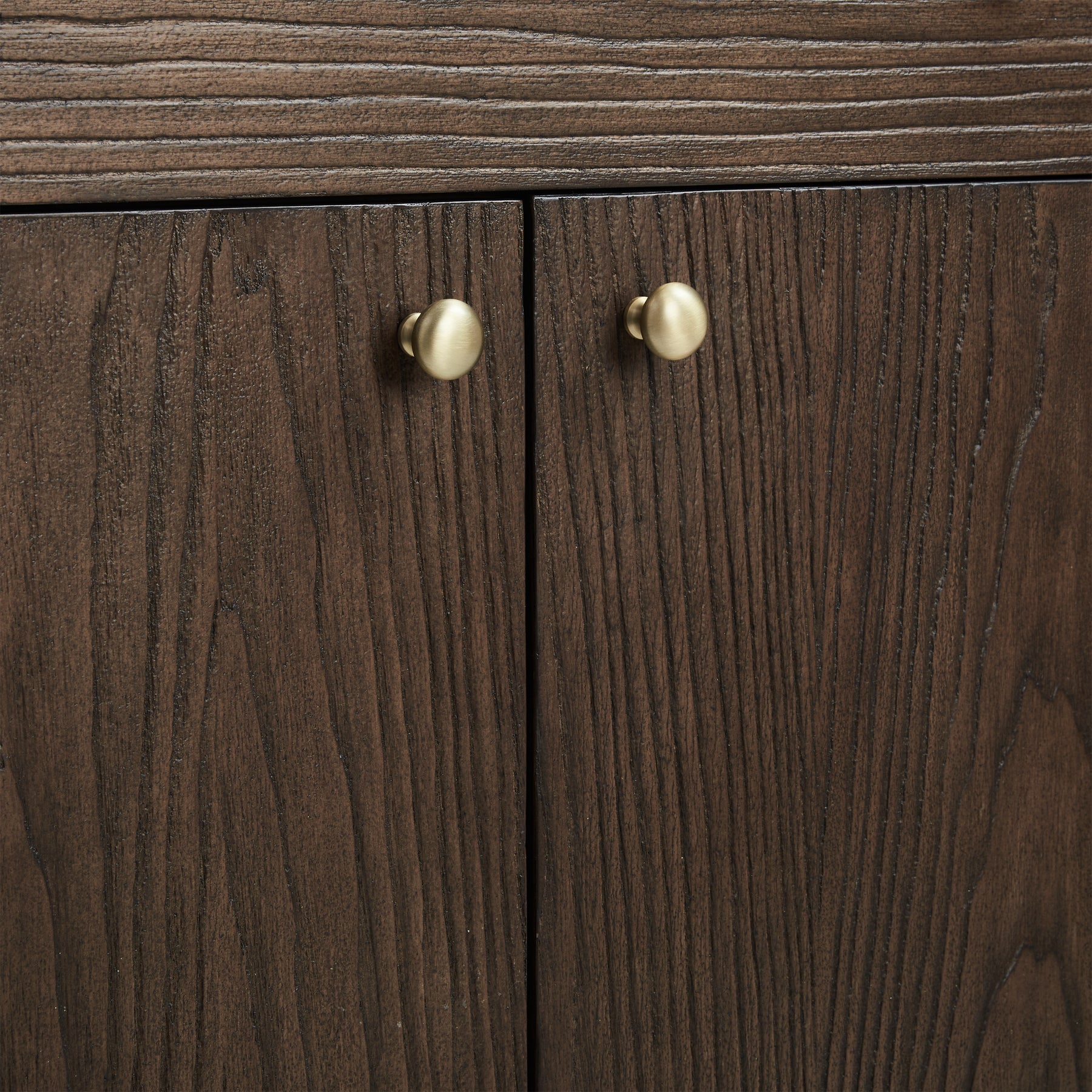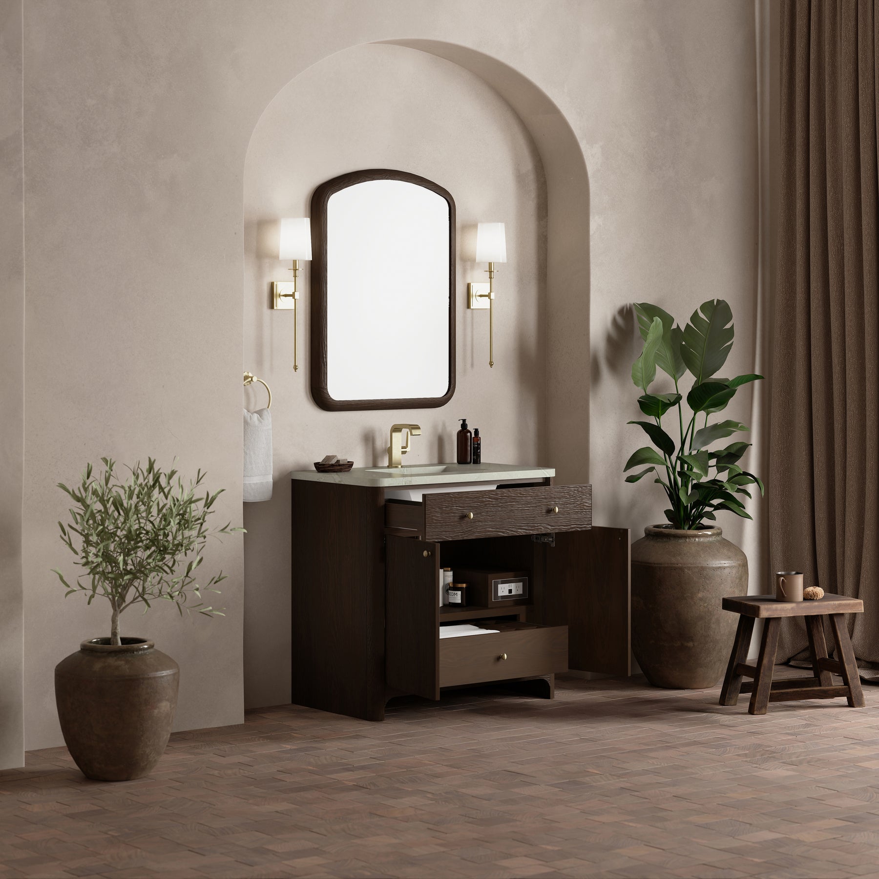 The Gracyn 36" Single Vanity is a tactile and visual delight, boasting soft curves and a rich Sable finish that brings character to your space. The sand-blasted finish on natural Ash gives textural and visual definition to the wood grain, truly bringing this piece to life. Featuring an integrated USB/120V power unit and smooth radius edges, the Gracyn is complemented by elegant Champagne Brass hardware. The two-door cabinet features ample storage with one exterior drawer, interior shelving, and one internal drawer. With the addition of a gorgeous Victorian Silver Silestone top and undermount sink, this vanity is a seamless integration of modern design and functionality.