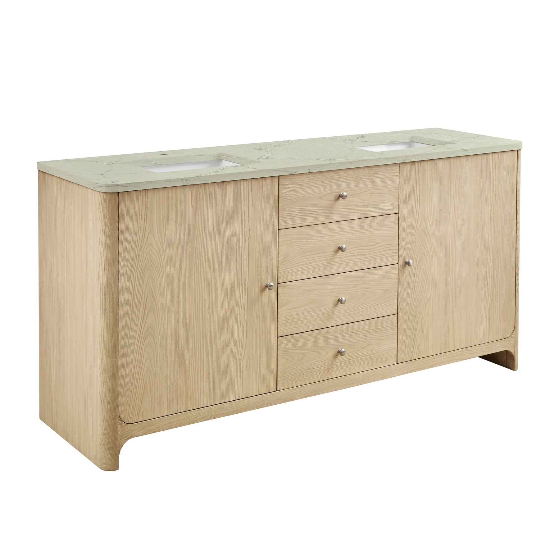 The Gracyn 72" Double Vanity is a tactile and visual delight, boasting soft curves and a fresh Coastal Driftwood finish that brings character to your space. The sand-blasted finish on natural Ash gives textural and visual definition to the wood grain, truly bringing this piece to life. Featuring two integrated USB/120V power units and smooth radius edges, the Gracyn is complemented by elegant Satin Nickel hardware. The two single-door cabinet features ample storage with four full-extension drawers, interior shelving, and two internal drawers. Complete the look with one of our 3 cm tops.