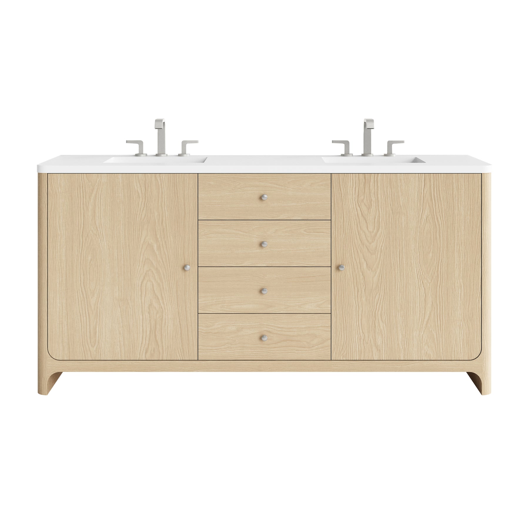 The Gracyn 72" Double Vanity by James Martin Vanities is a tactile and visual delight, boasting soft curves and a fresh Coastal Driftwood finish that brings character to your space. The sand-blasted finish on natural Ash gives textural and visual definition to the wood grain, truly bringing this piece to life. Featuring two integrated USB/120V power units and smooth radius edges, the Gracyn is complemented by elegant Satin Nickel hardware. The two single-door cabinet features ample storage with four full-extension drawers, interior shelving, and two internal drawers. With the addition of a classic White Zeus Silestone® top and undermount sinks, this vanity is a seamless integration of modern design and functionality.