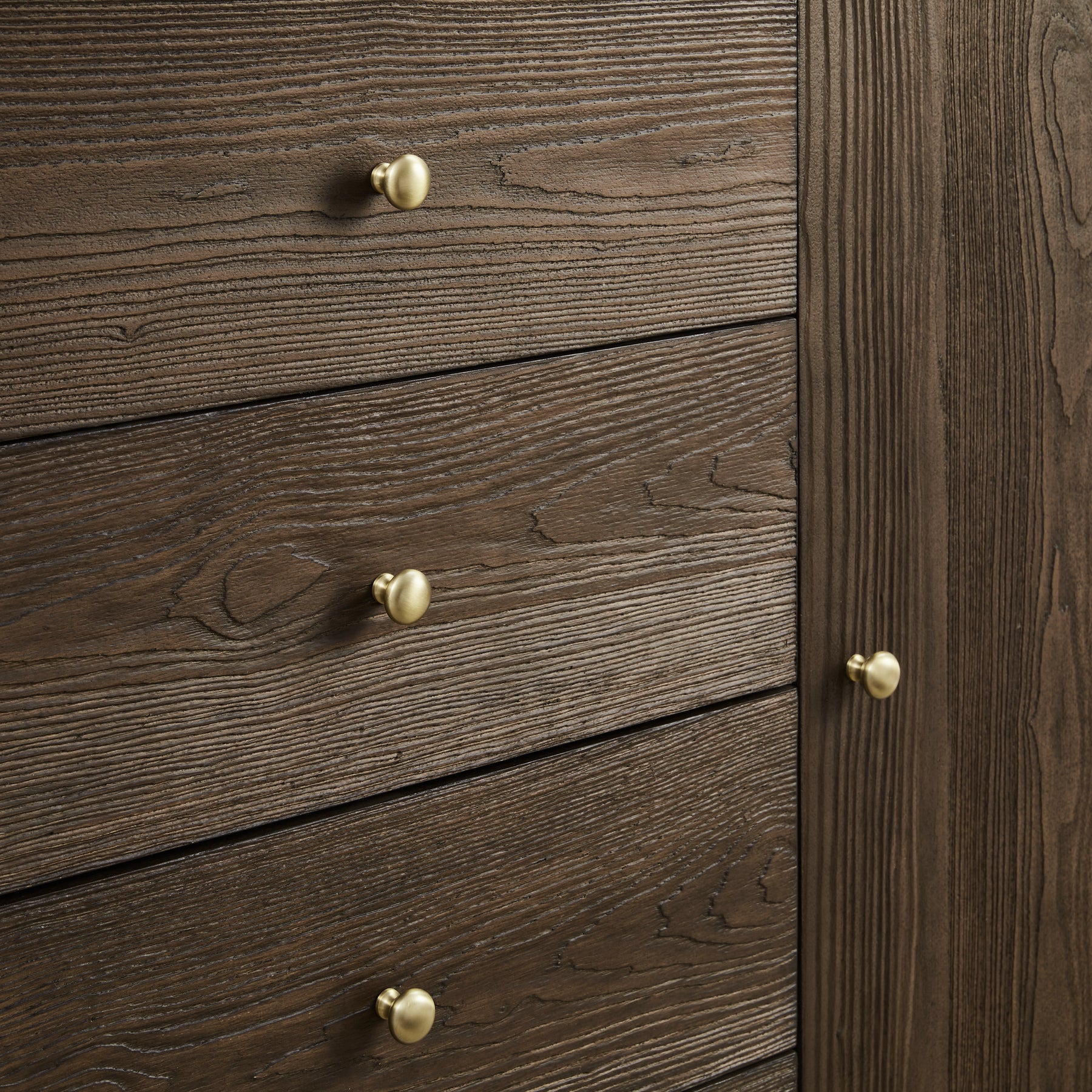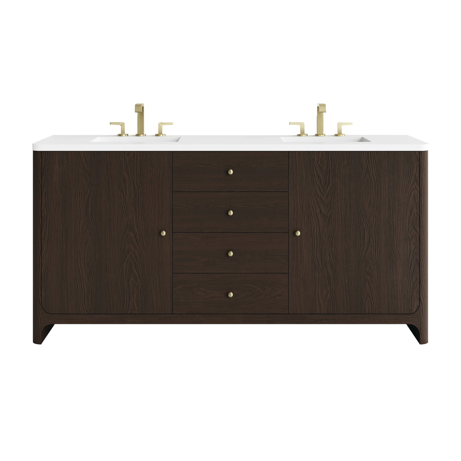 The Gracyn 72" Double Vanity by James Martin Vanities is a tactile and visual delight, boasting soft curves and a rich Sable finish that brings character to your space. The sand-blasted finish on natural Ash gives textural and visual definition to the wood grain, truly bringing this piece to life. Featuring two integrated USB/120V power units and smooth radius edges, the Gracyn is complemented by elegant Champagne Brass hardware. The two single-door cabinet features ample storage with four full-extension drawers, interior shelving, and two internal drawers. With the addition of a classic White Zeus Silestone® top and undermount sinks, this vanity is a seamless integration of modern design and functionality.