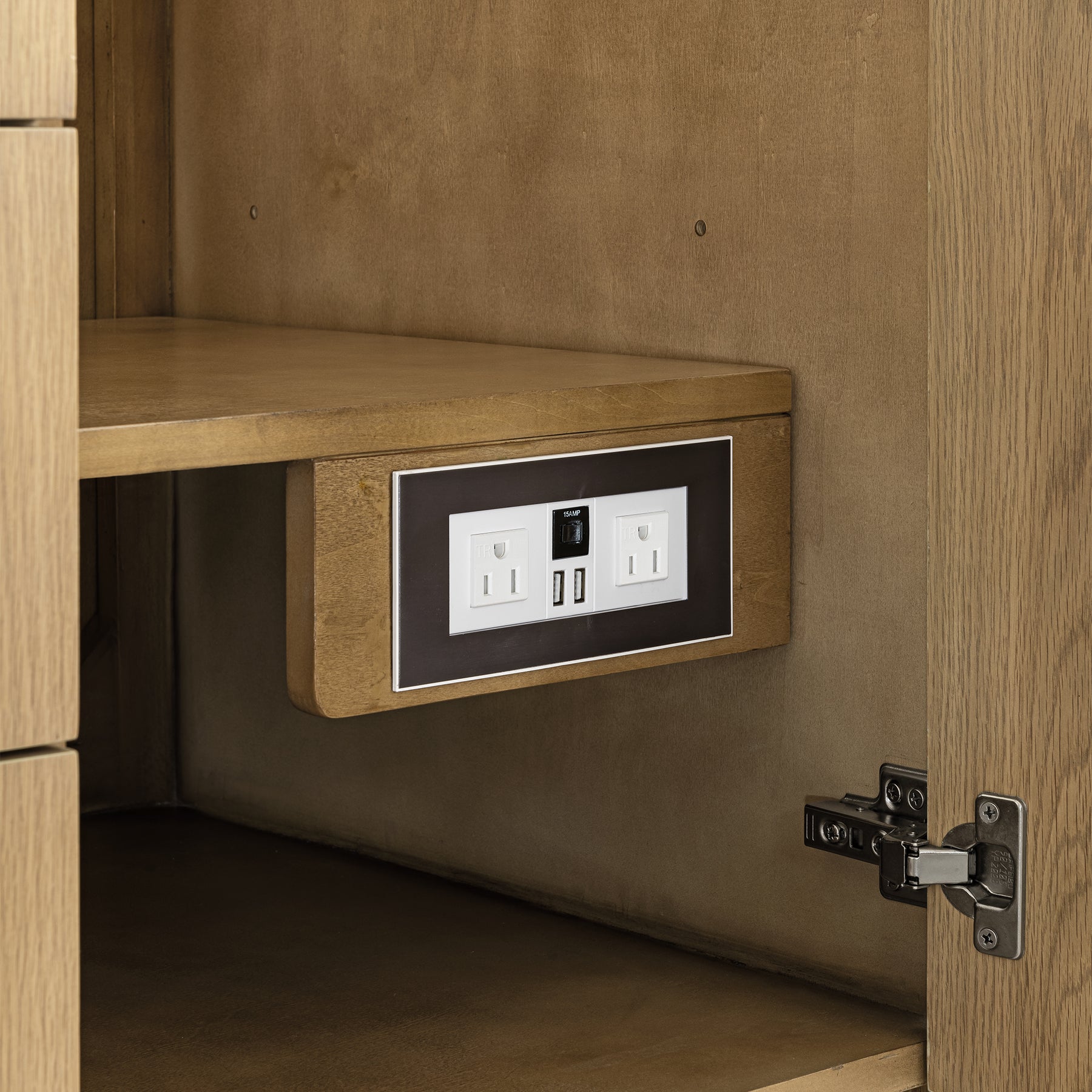 The cathedral grain Flat Cut Ash veneers and modern panel detailing on the doors and return panels give the Hudson collection the look of fine furnishings that is unexpected yet welcome for the bathroom space. The 60" Hudson Double Vanity features three generous drawers and one removable bamboo storage organizer tray, allowing for optimum organization. The right side door opens to reveal a convenient dual-power USB outlet while the left door conceals an additional drawer. The 3 CM Charcoal Soapstone Silestone top provides the perfect final touch.
