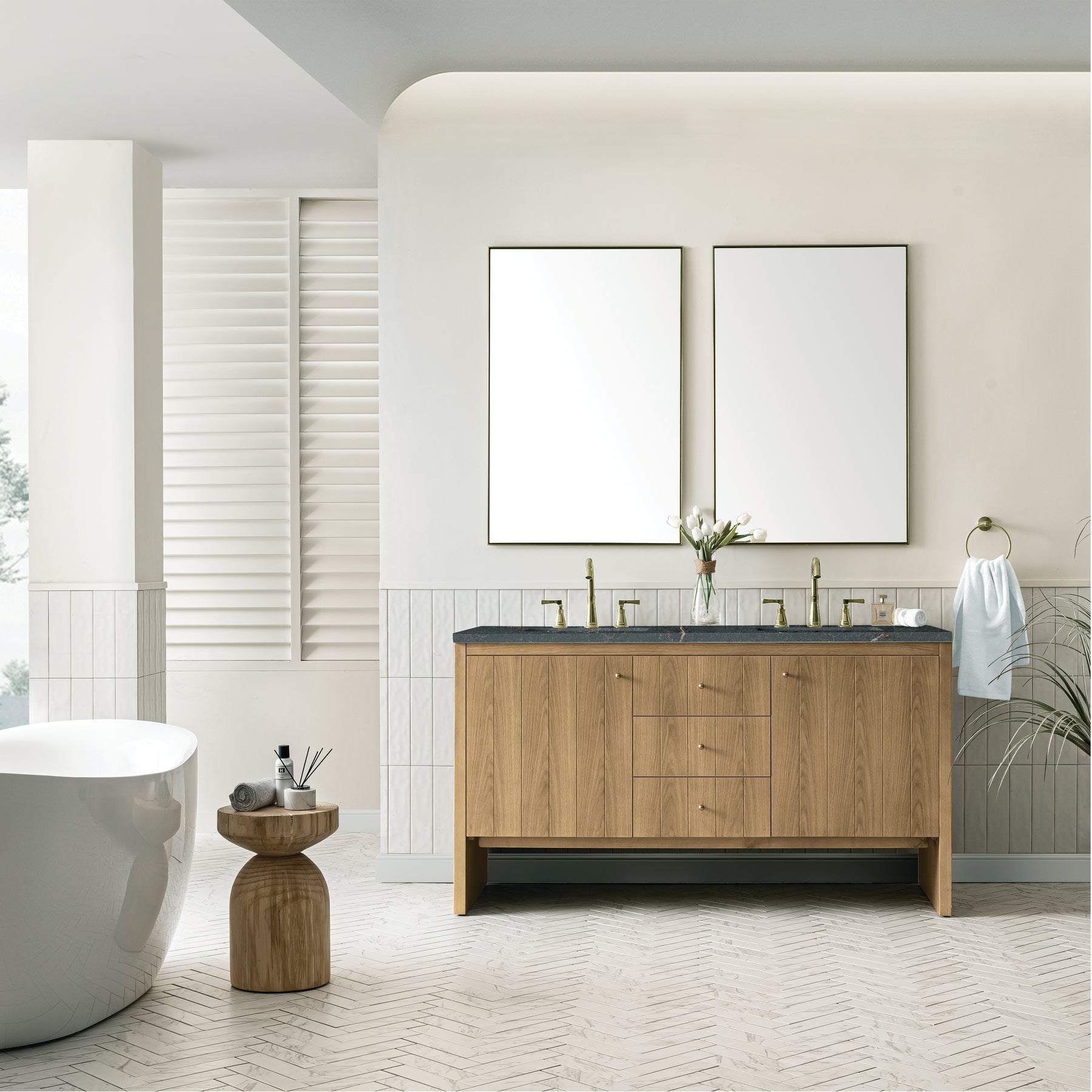 The cathedral grain Flat Cut Ash veneers and modern panel detailing on the doors and return panels give the Hudson collection the look of fine furnishings that is unexpected yet welcome for the bathroom space. The 60" Hudson Double Vanity features three generous drawers and one removable bamboo storage organizer tray, allowing for optimum organization. The right side door opens to reveal a convenient dual-power USB outlet while the left door conceals an additional drawer. The natural grain of the wood finish is enhanced by the Parisien Bleu Silestone top, offering a deep bluish hue with broad and intricate neutral veins highlighted by fine coppery accents.