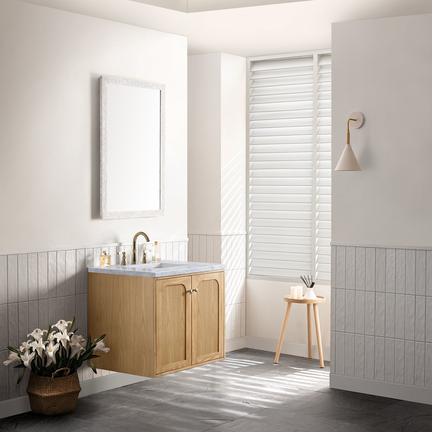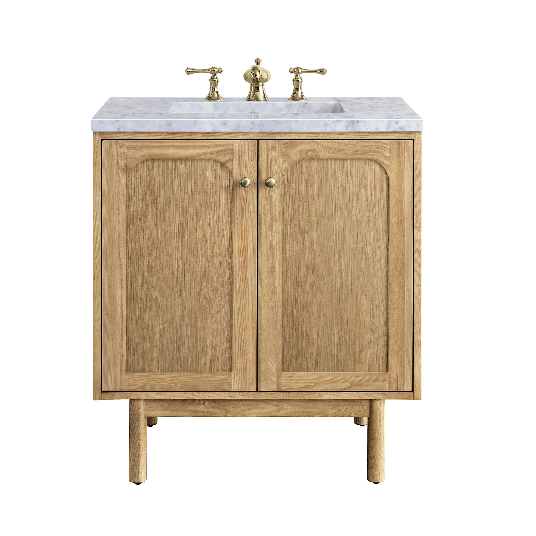 A modern interpretation of mid-century design, the Laurent 30" Single Vanity features organic charm with soft, rounded picture-frame details. Its Light Natural Oak finish over cathedral grain Ash veneers highlights the beautiful, natural wood texture, while Champagne Brass knobs lend a touch of elegance. Designed for versatility, this vanity cabinet features two doors with an adjustable shelf, a conveniently integrated USB/120V power unit, and the option to install as a freestanding or floating vanity. Perfectly crafted and beautifully appointed, Laurent brings an understated elegance to any bathroom. A timeless Carrara Marble top completes the look.
