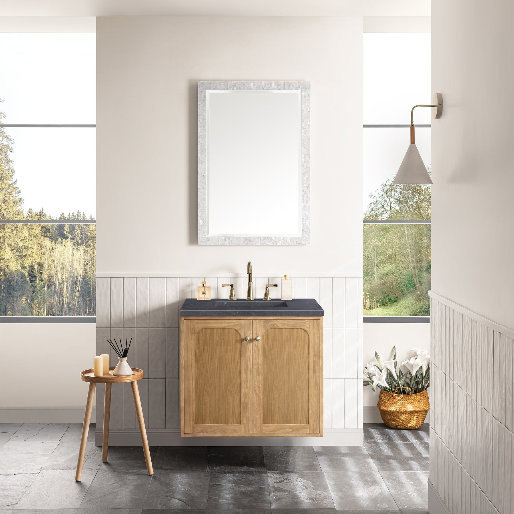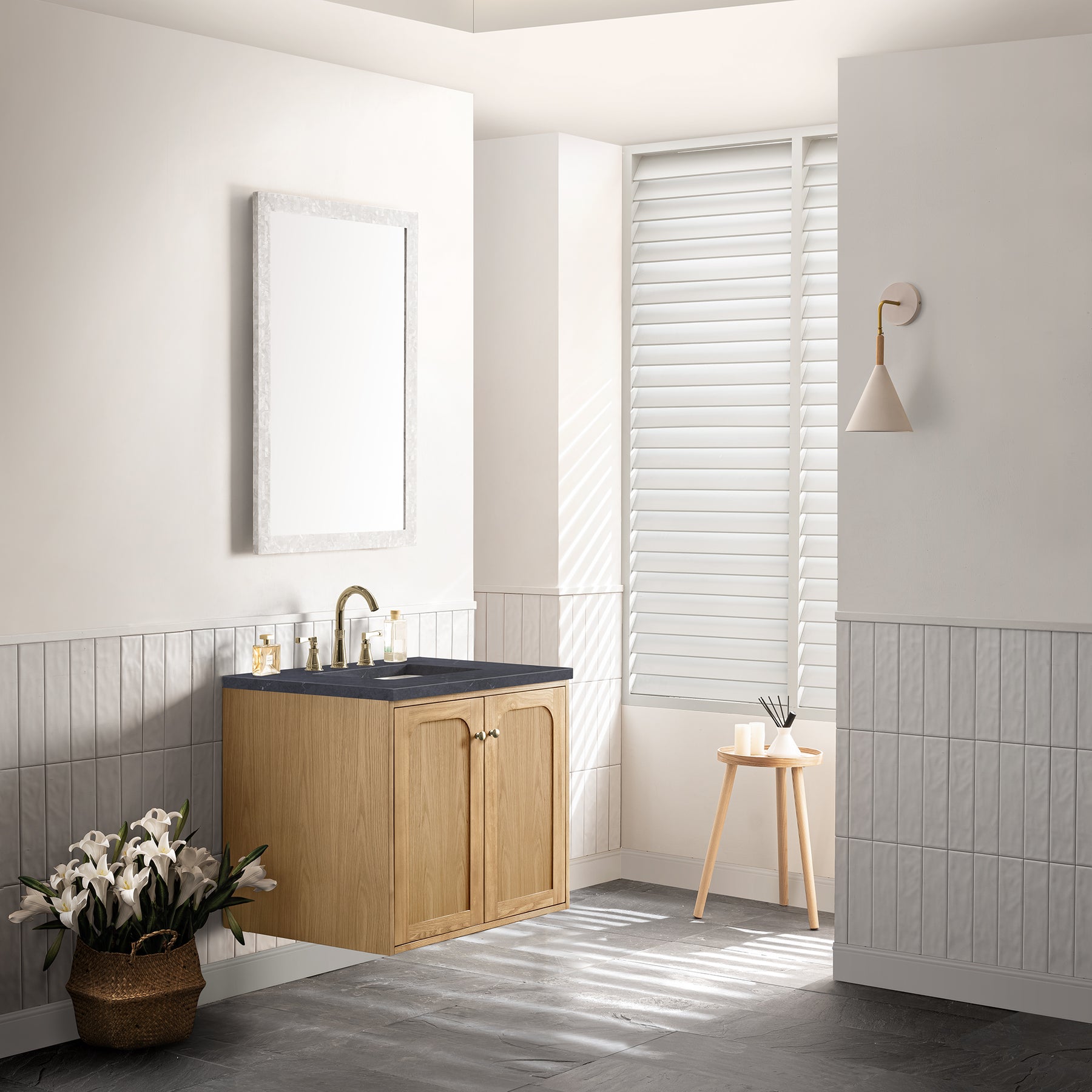 A modern interpretation of mid-century design, the Laurent 30" Single Vanity features organic charm with soft, rounded picture-frame details. Its Light Natural Oak finish over cathedral grain Ash veneers highlights the beautiful, natural wood texture, while Champagne Brass knobs lend a touch of elegance. Designed for versatility, this vanity cabinet features two doors with an adjustable shelf, a conveniently integrated USB/120V power unit, and the option to install as a freestanding or floating vanity. Perfectly crafted and beautifully appointed, Laurent brings an understated elegance to any bathroom. The addition of a matte Charcoal Soapstone Silestone top completes the look.